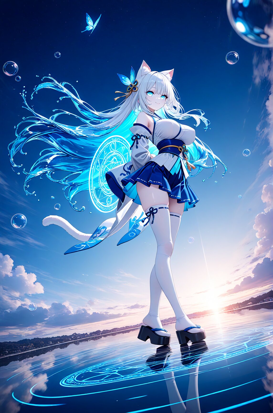 Anime illustration, CG art, 3D model, 3D rendering, 3D skin texture, high detail, depth of field, 1 person, cat ears, cat tail, hime cut, side ponytail, slanted eyes, sky blue eyes, white skin, gothic lolita, 8K, masterpiece, best quality, amazing quality, very aesthetic, (volumetric lighting), overexposed,