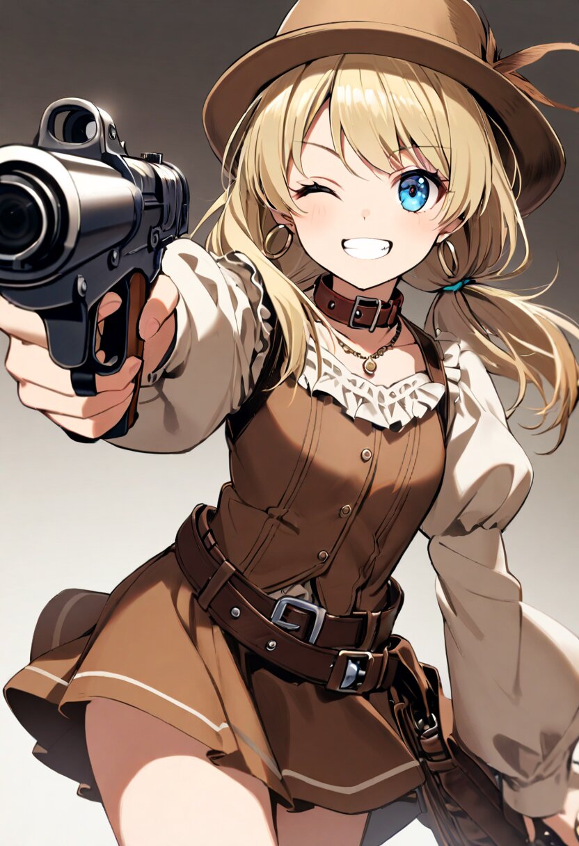 1girl, solo, 15years old, (brown ten-gallon hat), long hair, blonde hair, blue eyes, low twintail, straight hair, hoop earring, necklace, collar bone, (long sleeves, puff sleeves, white frills blouse, brown vest, brown mini skirt), belt, western boots, grin, one eye closed, aiming at viewer, gun, outdoors,