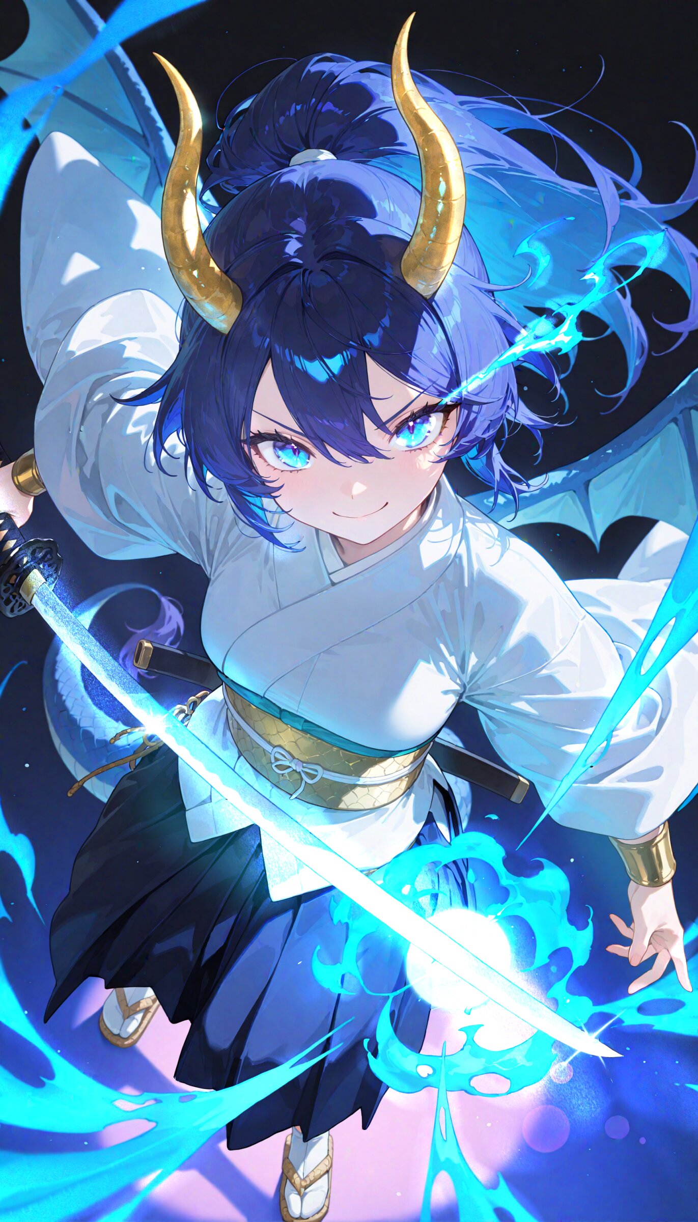 close to viewer (from above,looking up:1.2) looking at viewer, 1dragon girl, solo, (from below,looking down:1.2), looking at viewer, dragon girl, 17yo, (2dragon gold horns attached to the head:1.2), blue hair high ponytail, pony tail hair, (wide ponytail:1.1), torn hair, (indigo blue eyes:1.1), cute, cool, (muscle,buff well-built body,ultra-detailed muscle:0.6), first-rate female bodies perfect body medium breasts tone hips Average height,indigo blue eyes, blue dragon tail, (2long blue dragon wings on back:1.1), dark blue hakama, (overskirt:1.2) White Japanese Clothes, (White wide sleeve:1.0) gold and white stripe obi, inner, bracer, straw sandals, tabi, (serious smile:1.0), v-shaped eyebrows, closed mouth, fighting smile, eye trail,, glowing japanese short sword, (japanese sword action:1.1), glowing sword katana slash katana diagonally from the shoulder glint, (swirling blue energy,energy magic,energy:1.2), glowing eastern dragon blue aura, (simple pastel color background:1.0) depth of field, bokeh, super fine concept art, hard surface, 8K, unreal engine, masterpiece, best quality, amazing quality, very aesthetic, absurdres, you can add scenery, (volumetric lighting), To make the background more distinctive. professional art lots of details, , overexposure, shiny-glistening, (watercolor style:0.0), (pastel color style:0.0) <lora:noline (1):-0.5> <lora:sdxl2-flat2-512b:0.15> <lora:facelightup_xl_v10:0.5>