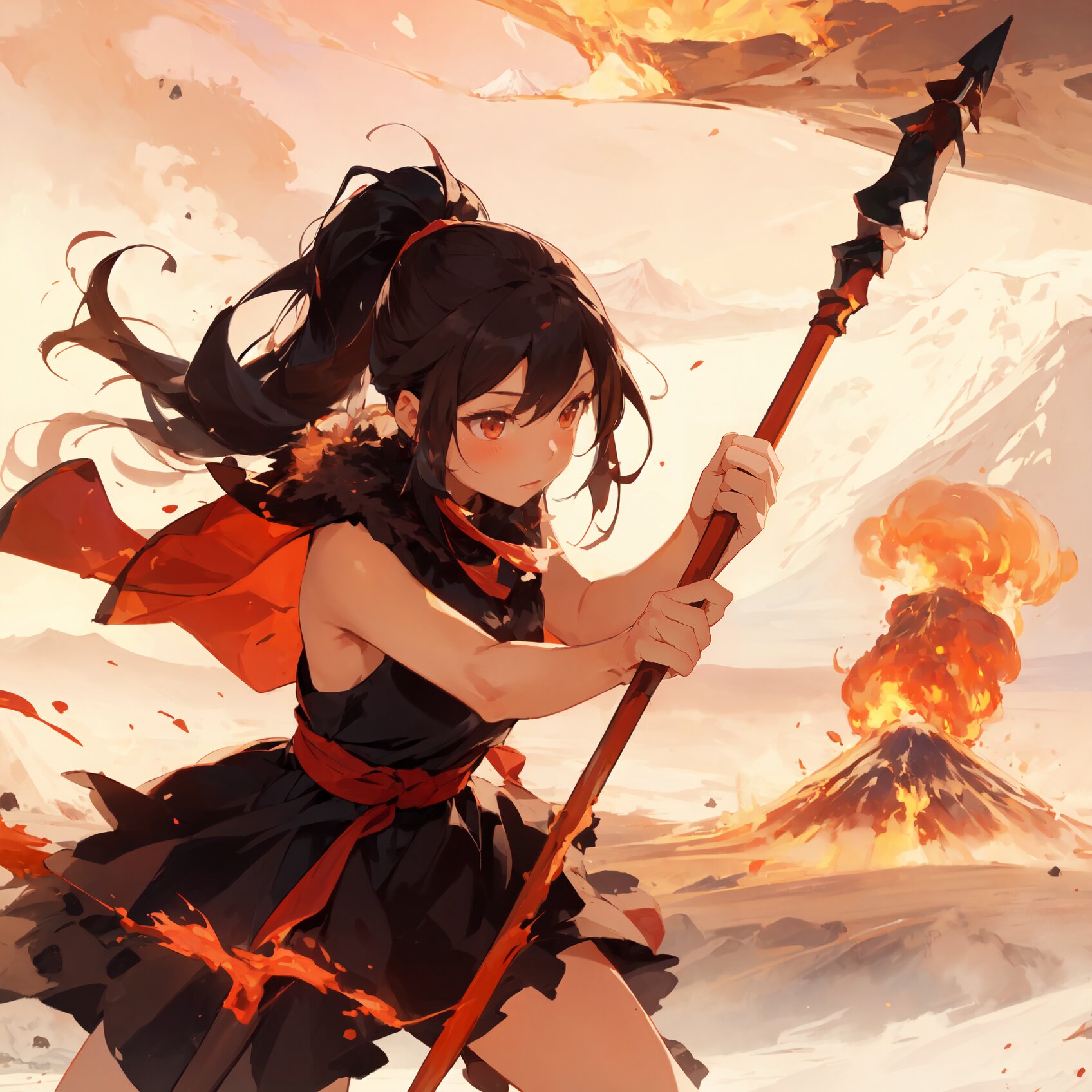 masterpiece, best quality, 1girl, kawaii, pony tail, simple Sleeveless brown fur dress, battling, fighting pose, Readying the simple black stone Spear, flowing red burning lava around the girl, background of A huge erupting volcano Mt. Fuji Flowing,blue sky, Adventure, Close-up of girl, cowboy shot, in Stone Age, good finger,