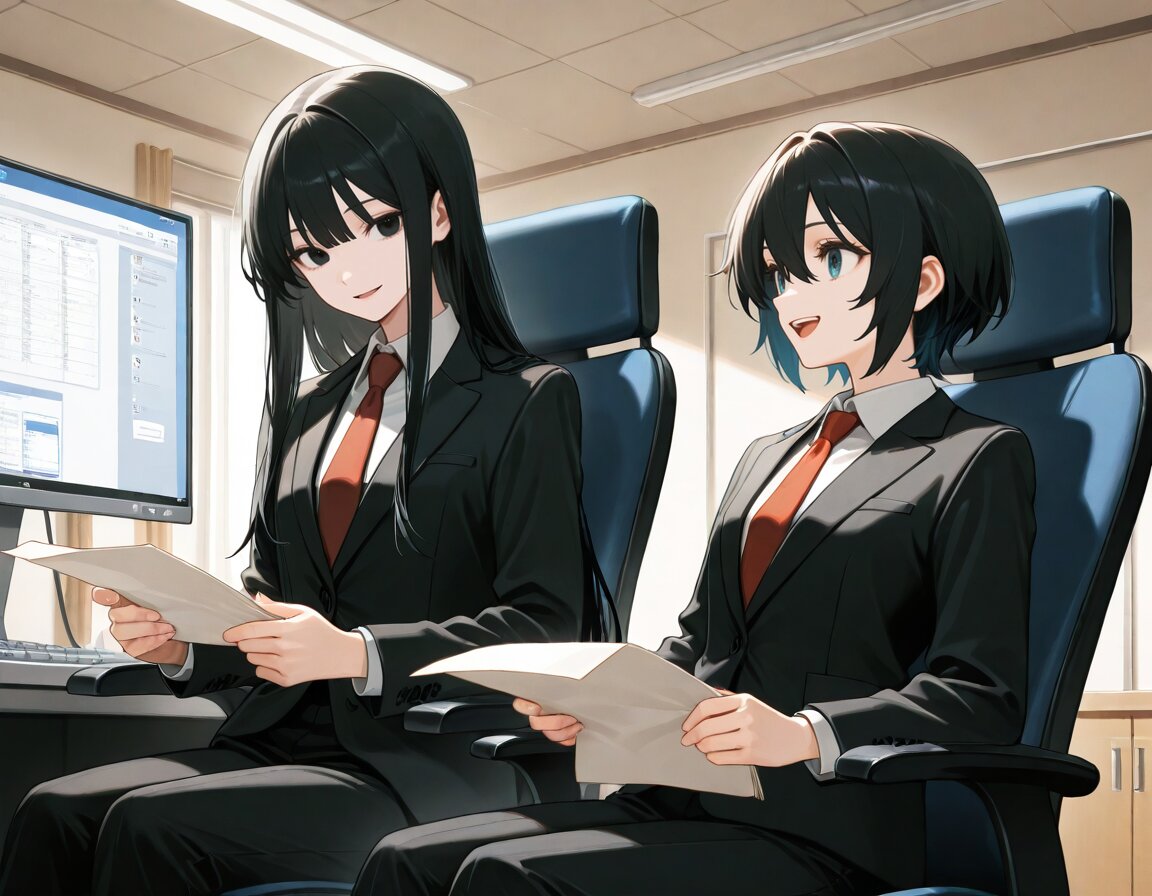 masterpiece,best quality,highres,highly detailed,detailed eyes,general,2girls,long hair,long black suit,red necktie,long pants,smile,wolking,sitting in the chair,using computer,in office,indoors,cowboy shot,looking at another,holding paper,open mouth,BREAK 2girls,short hair,long black suit,red necktie,long pants,smile,wolking,sitting in the chair,using computer,in office,indoors,cowboy shot,looking at another,holding paper,