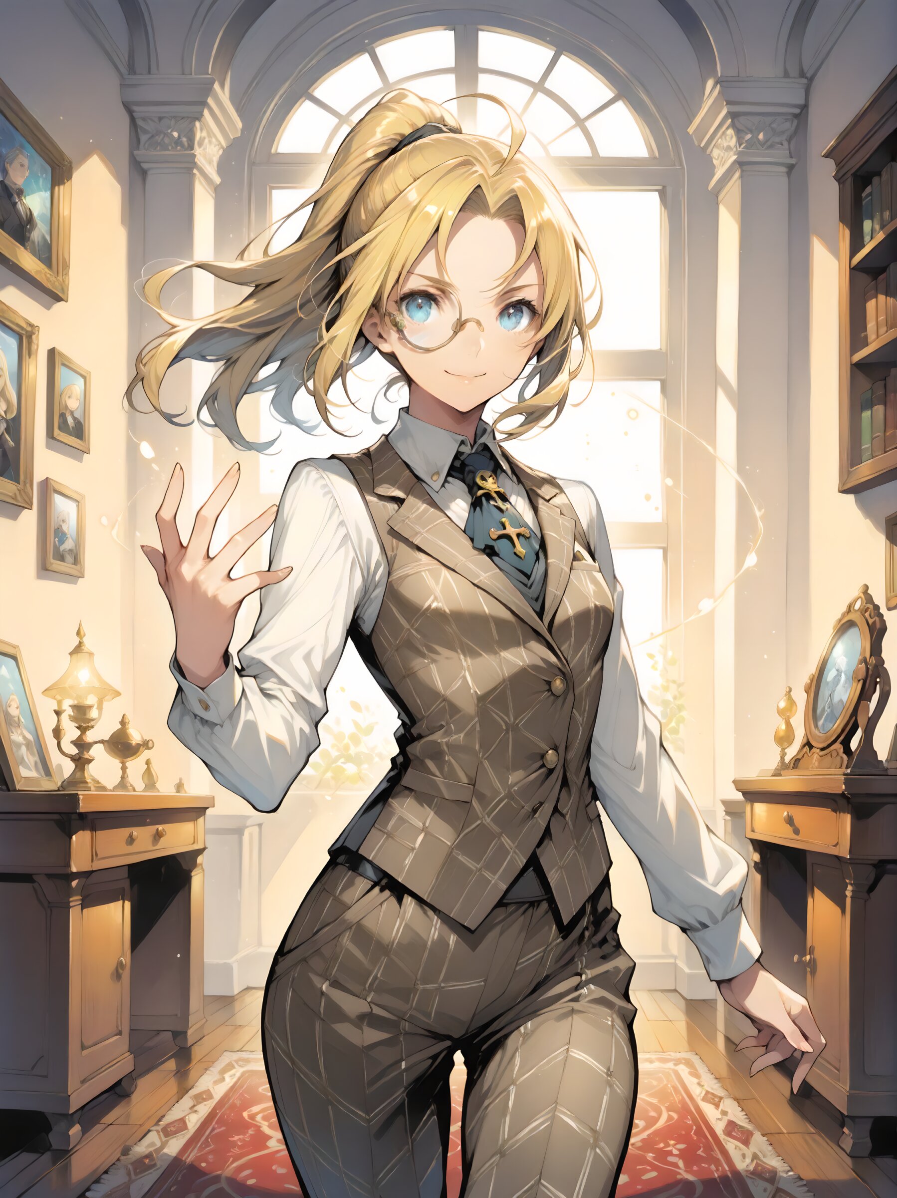 masterpiece, best quality, official art, concept art, a white background with a minimalist design, lots of negative space, delicate anime-style illustration, adventurous spirit, great part of the story, solo, (young girl), small body, beautiful face and eyes, Beautiful, clear, curious blue eyes, Beautiful hair, floating hair, shoulder length hair, (blonde hair), bobbed hair with ponytail, antenna hair, ahoge, shiny skin, pretty, (flat chest), (small breasts), active personality, ((tweed suit:1.2)) (paired with a (waistcoat)), long sleeves, a silk tie, a ((monocle:1.1)), cinematic angle, jojo pose, official wallpaper, big smile, spread fingers, cowboy shot, Dieselpunk, A sophisticated detective's office, dimly lit by the glow of city lights through the window. A vintage wooden desk adorned with scattered case files, The room exudes an atmosphere of old-world charm, with Persian rugs adorning the hardwood floor, casting intricate patterns. A mahogany bookshelf lines one wall, showcasing an array of leather-bound tomes on criminology and detective fiction., A muted palette of deep blues and rich browns dominates the room, creating an air of sophistication and intellectualism.
