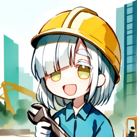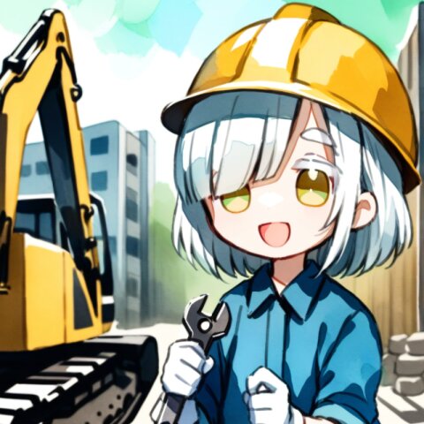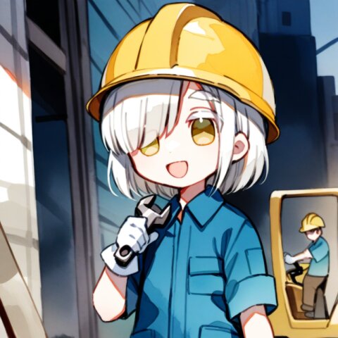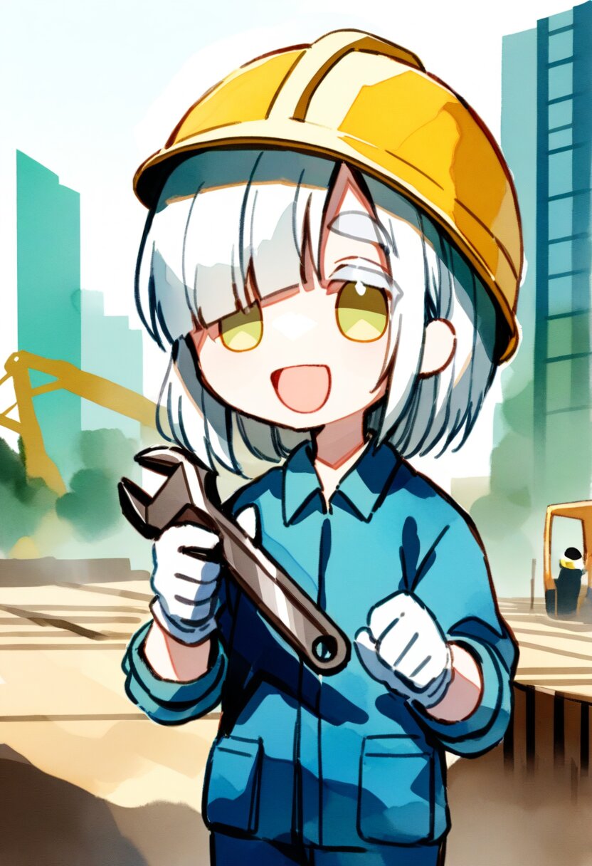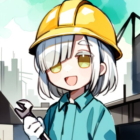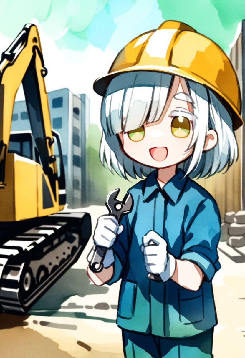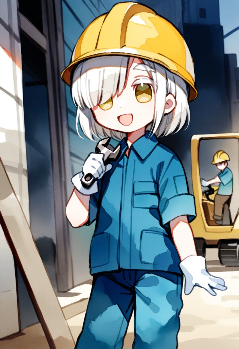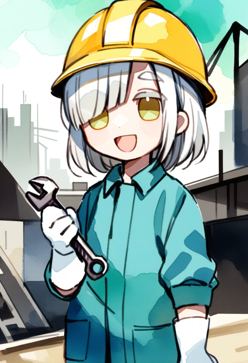 <lora:inmnstylexl:1>, best quality, masterpiece, very aesthetic, watercolor painting, general, chibi, 1girl, 10 years old, (bright white hair), short hair, blunt bangs, white thick eyebrow, white colored eyelashes, (hair over one eye), smile, open mouth, blue work wear, white gloves, yellow helmet, holding wrench, construction site, mint green eyes