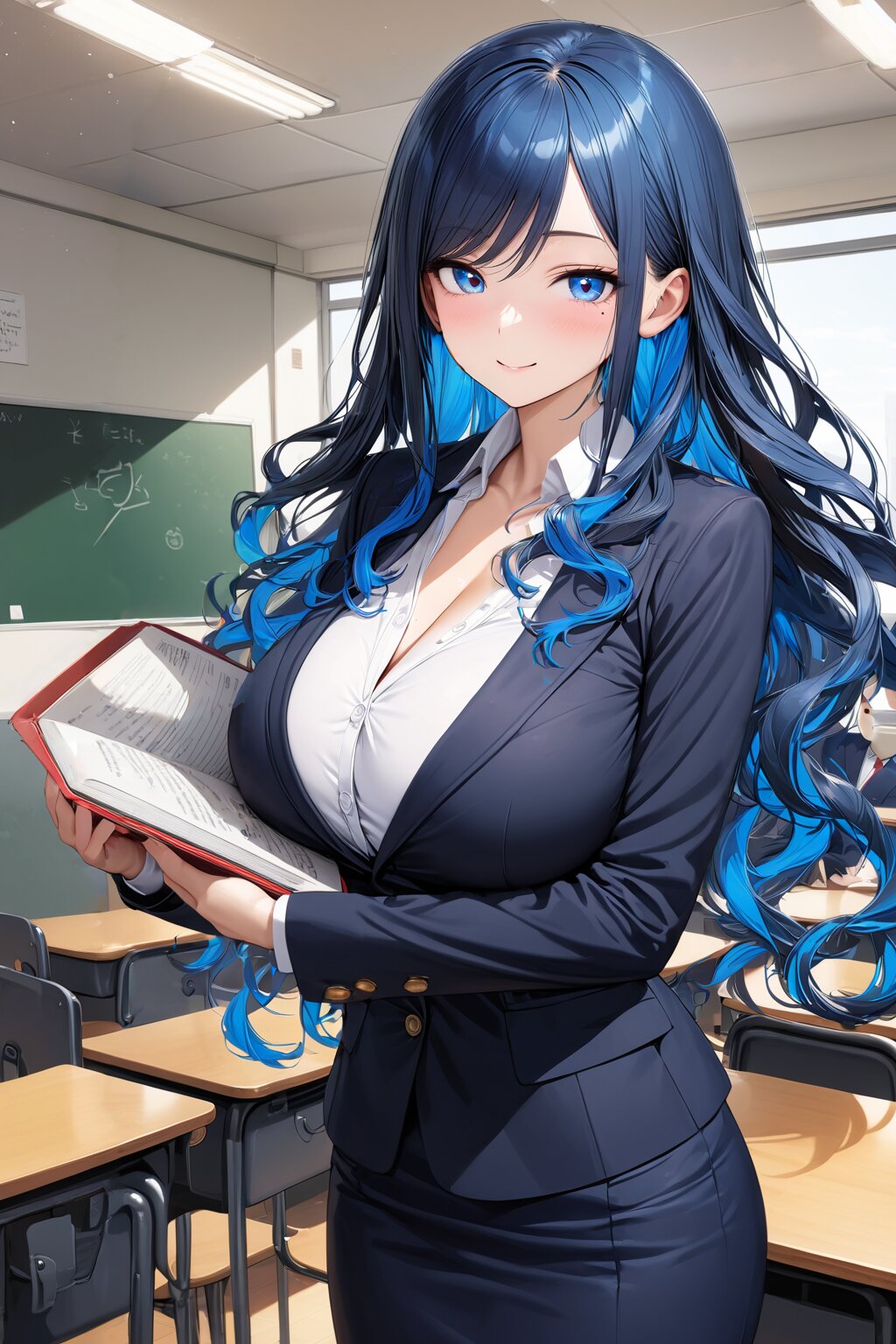 1 girl, classroom,blackboard,many students, huge breast,slender face,slender,(shiny skin),tall, (navy and cerulean multicoloerd hair:1.3),(absurdly long straight hair:1.3),swept bangs,(sidelocks),(wavy hair:1.3), ((hair on chest:1.3)), (glowing blue eyes:1.3),(narrow eyes:1.3),(tareme:1.3),(sleepy eyes),(mole under eye:1.3), seductive smile,chuckle,smile, teacher,white collared shirt,navy pencil skirt,black pantyhose, navy jacket,ladies business suit,red necktie, holding text book,i'll teach, cowboy shot,dynamic angle,looking at viewer,from side:0.8, ((best quality)),((very high resolution)),full color,((ultra detailed)),extremely detailed CG,super fine illustration, manga style,hyperrealistic,photorealistic, perfect anatomy,super detailed skin,(beautiful detailed clear eyes),