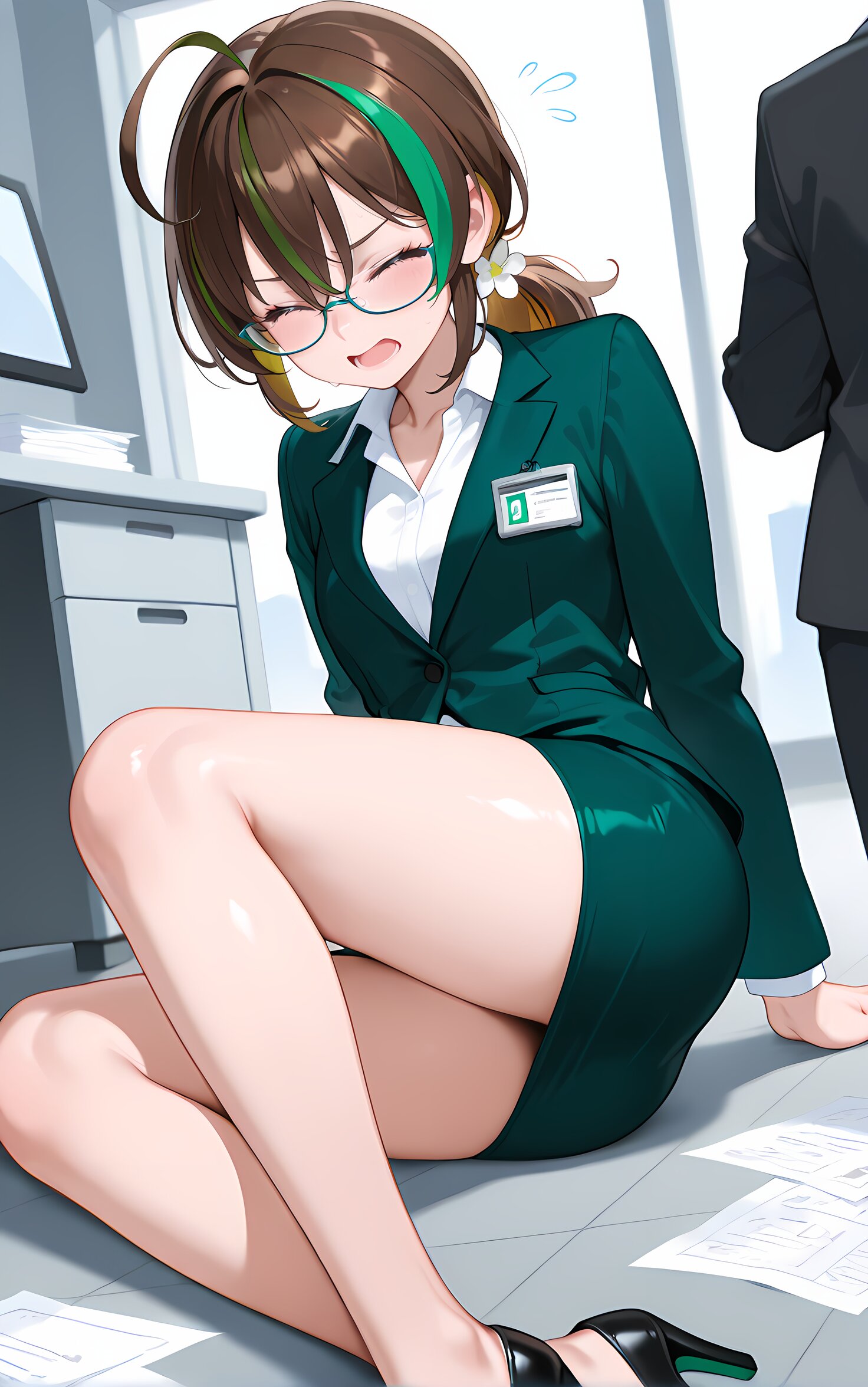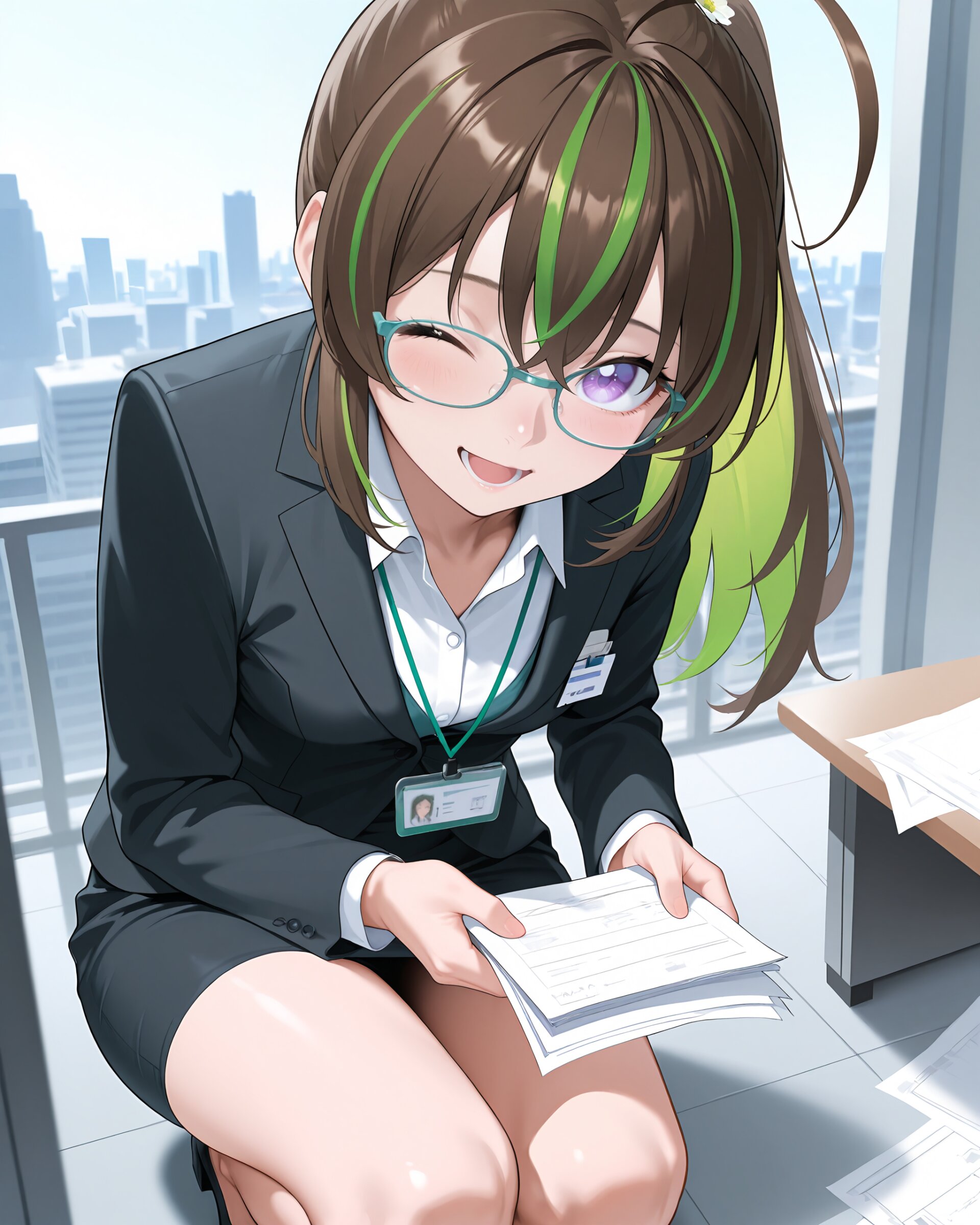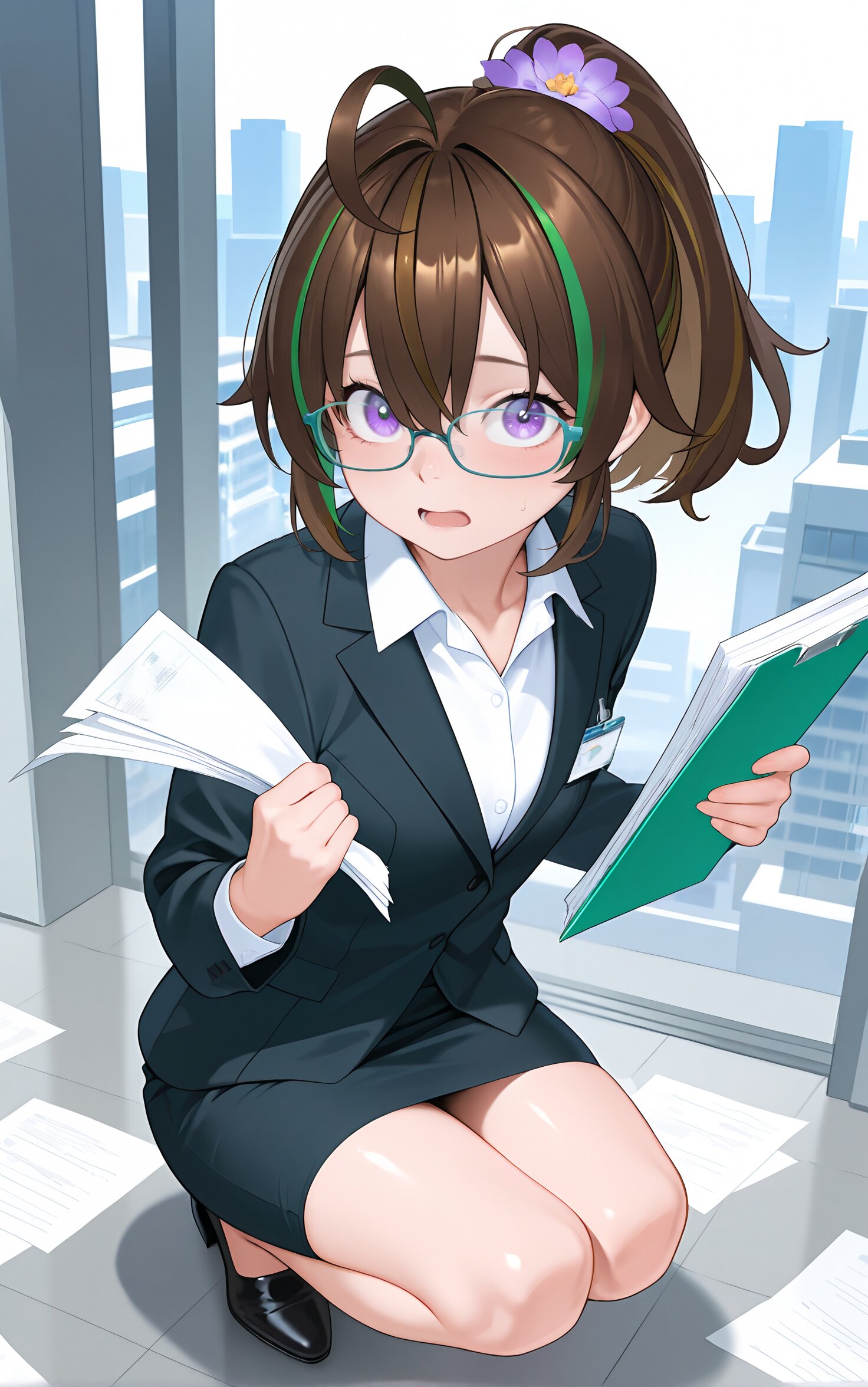 female,adult woman,solo,(ponytail,brown hair:1.3),(green streaked hair:1.5),(glossy hair:1.3),(hair between eyes:1.1),(bangs:1.2),hair detail,(ahoge:1.2),(emerald color inner hair color:1.4),detailed hair,purple eyes,wide eyes,detailed eyes,facial detail,hair_flower,blue-framed_eyewear,(details of glasses:1.1),(small breasts:1.2), looking at object,<lora:TestProject3-10:0.8>,Zasuko_Pony_XL,cityscape,business_suit,squatting,black clothes,ID,office,looking_at_viewer,(surprising:0.4),(open mouth:0.5),holding file,scattered paper,(flustered:0.6),(sweat:0.2),(bitter laugh:0.3),wink,