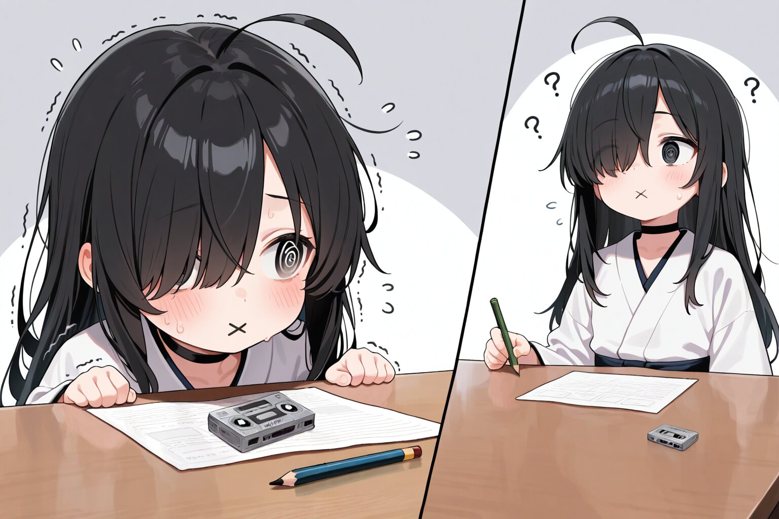 1 little girl, upper body, masterpiece, best quality, amazing quality, very aesthetic, black hair, long hair, ahoge, (hair over one eye:1.2), black eyes, @_@, (:x:1.2), confused, troubled, sweat, flying sweatdrops, (looking away:1.2), trembling, choker, white kimono, old cassette tape, pencil, table,