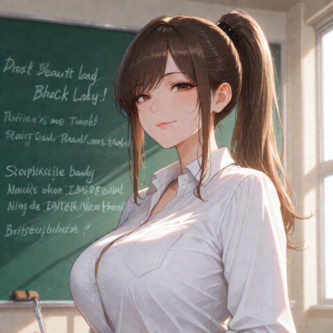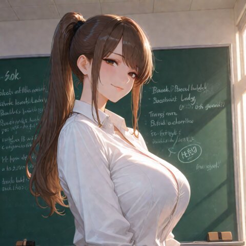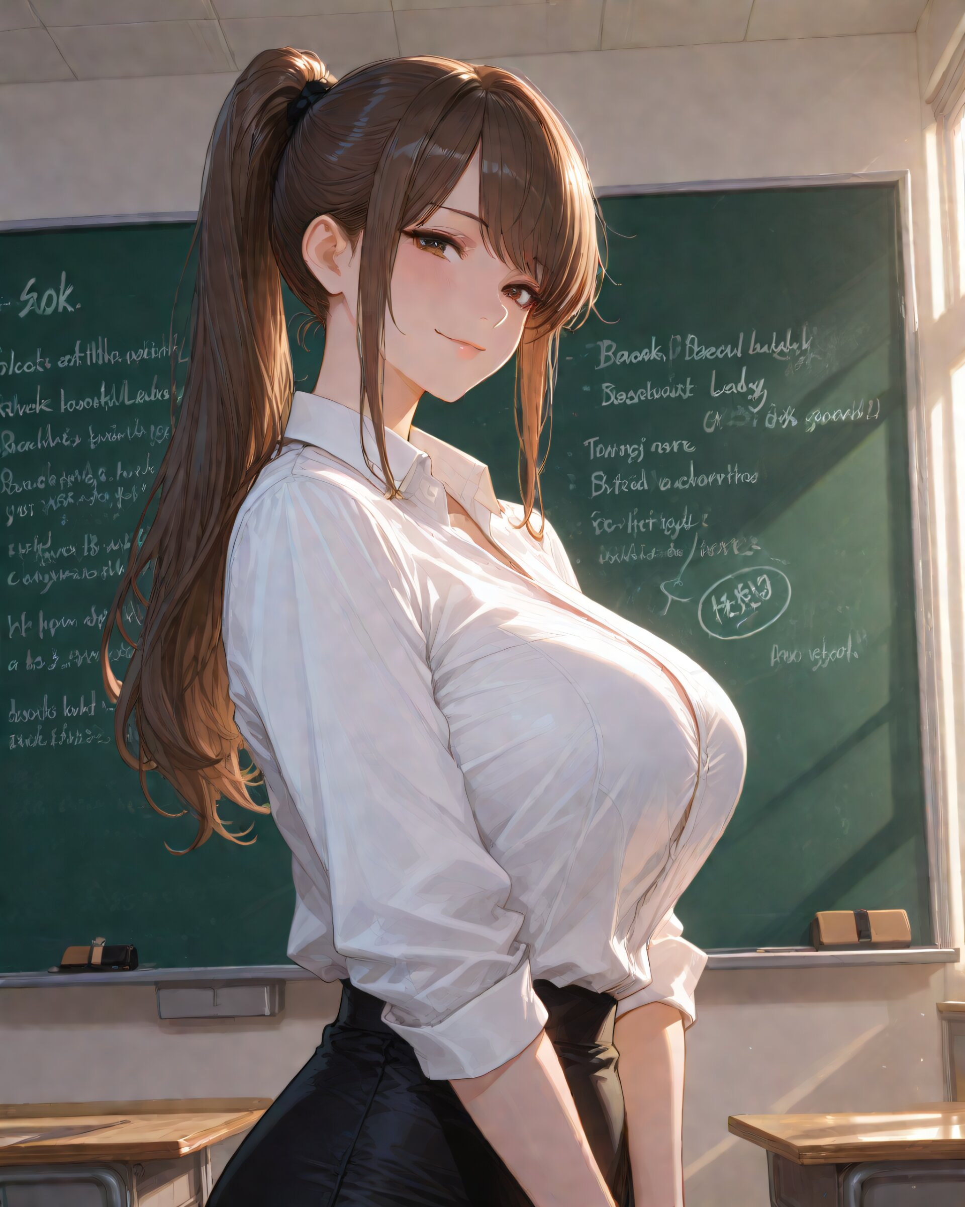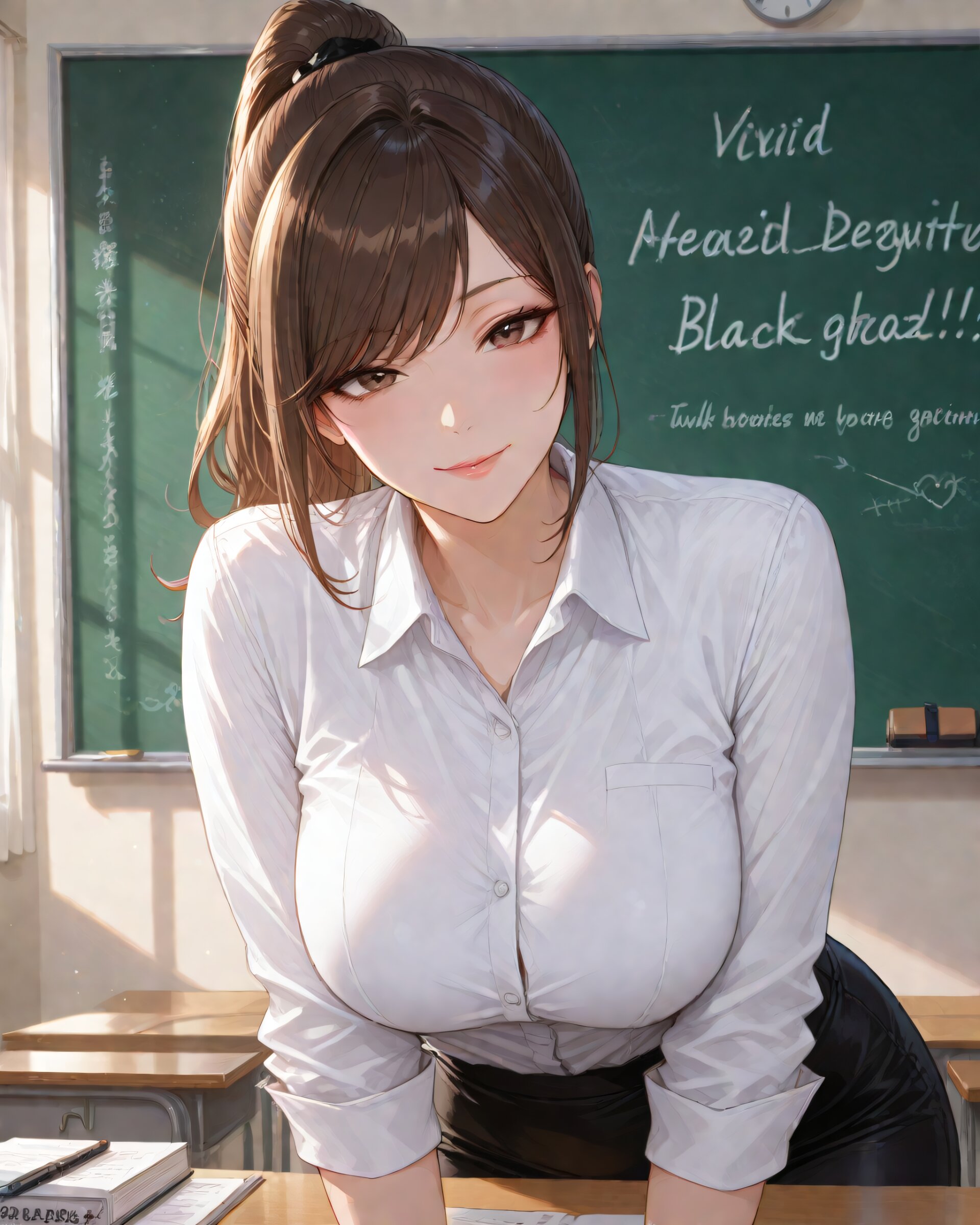 <lora:hyper_sdxl_8_step_lora_f16:1>,, 1Girl, teacher, writing in black board, school, class room, teaching English, upper body, BREAK beautiful lady, Married woman, 30 years old, long hair, (brown hair), swept bangs, high ponytail, large breasts, white shirts, suits, skirt, seductive smile, BREAK masterpiece, amazing quality, best quality, ultra-detailed, 8K, newest, vivid, dramatic lighting,