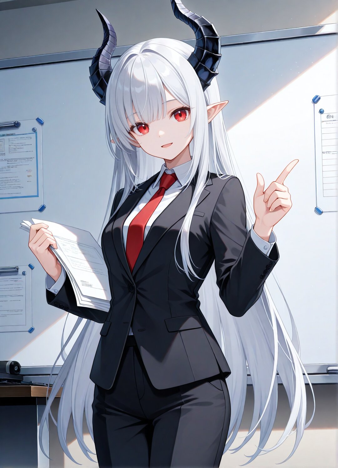 masterpiece,best quality,highres,highly detailed,detailed eyes,general,1girl,solo,17yo,(black dragon horns,two dragon horns,silver hair, very long hair,bangs, red eyes,holding papers,index finger raised,index finger to whiteboard),cute girl,slender,Very long sleeves that cover wrists,medium breasts,dragon girl,dragon ears,pointy ears,light smile,closed mouth,(long black suit,red necktie, long pants),boots,slender girl,looking at viewer,whiteboard,in office,in company,indoors,cowboy shot,open mouth,whiteboard background,
