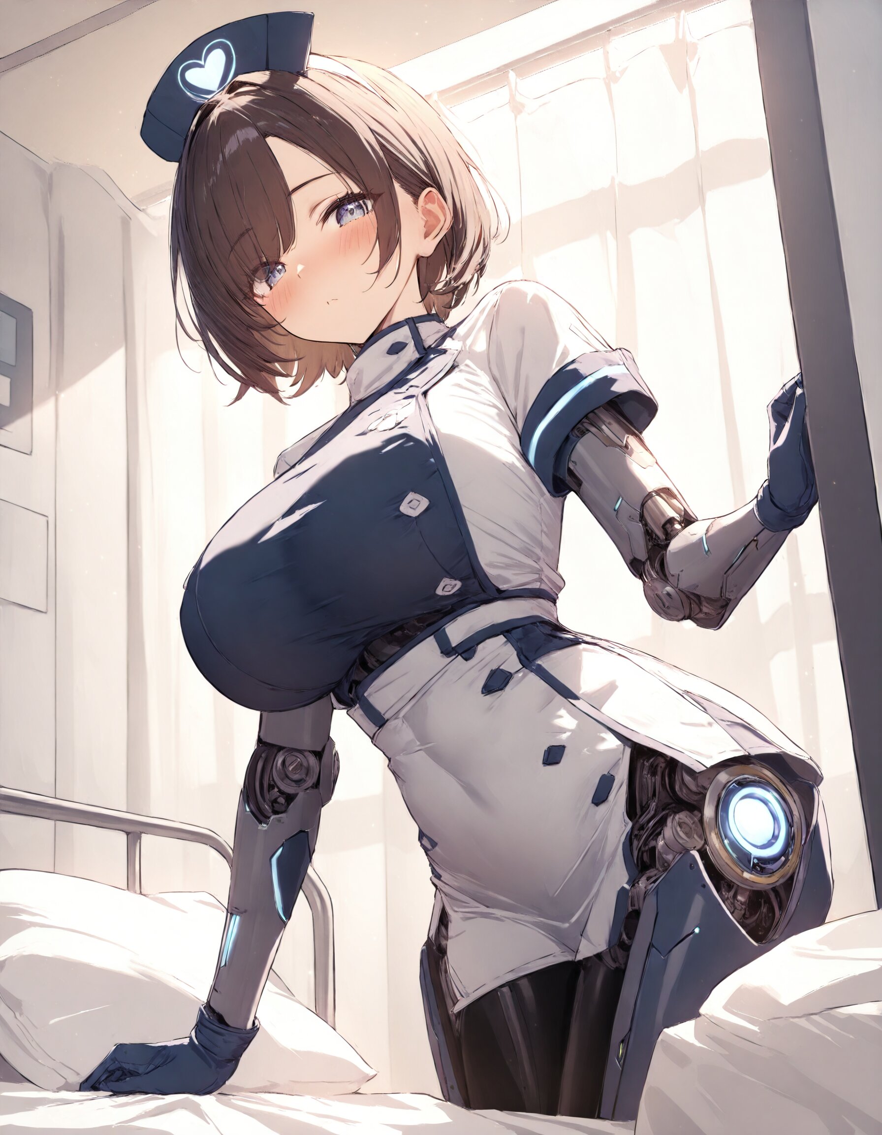 1girl, solo, short hair, bangs, eyebrows visible through hair, blush, large breasts, indoors, bed, hospital bed, pillow, bed sheet, gloves, hat, nurse cap, looking at viewer, mechanical arms, mechanical legs, mechanical parts, standing, masterpiece, great score, high score, absurdres