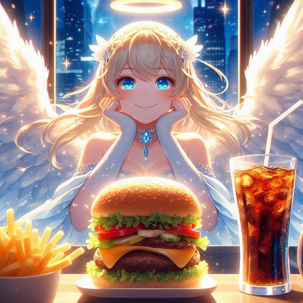 映画のポスターの様なイラスト。映画のラストシーンの様なダイナミックな構図と情景。オフィシャルアート。 日本のアニメの画風のセミリアルな萌えヒロイン。グラマラスで金髪碧眼の天使少女。光と光の粒子で出来た天使の衣装を着ている。世界で最も有名なハンバーガショップで大きなハンバーガーとコーラを前に大満足な笑顔で私を見つめている。