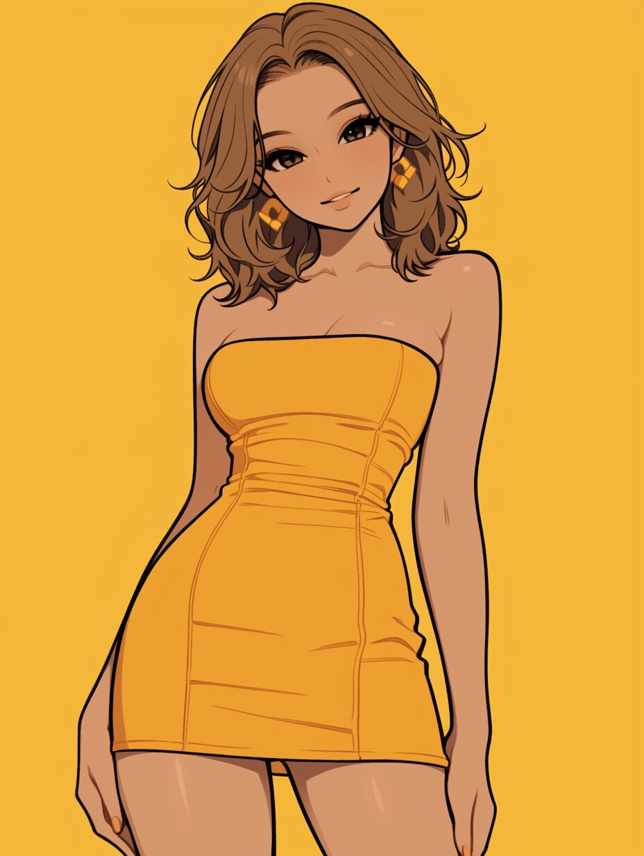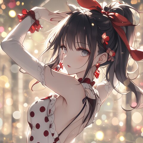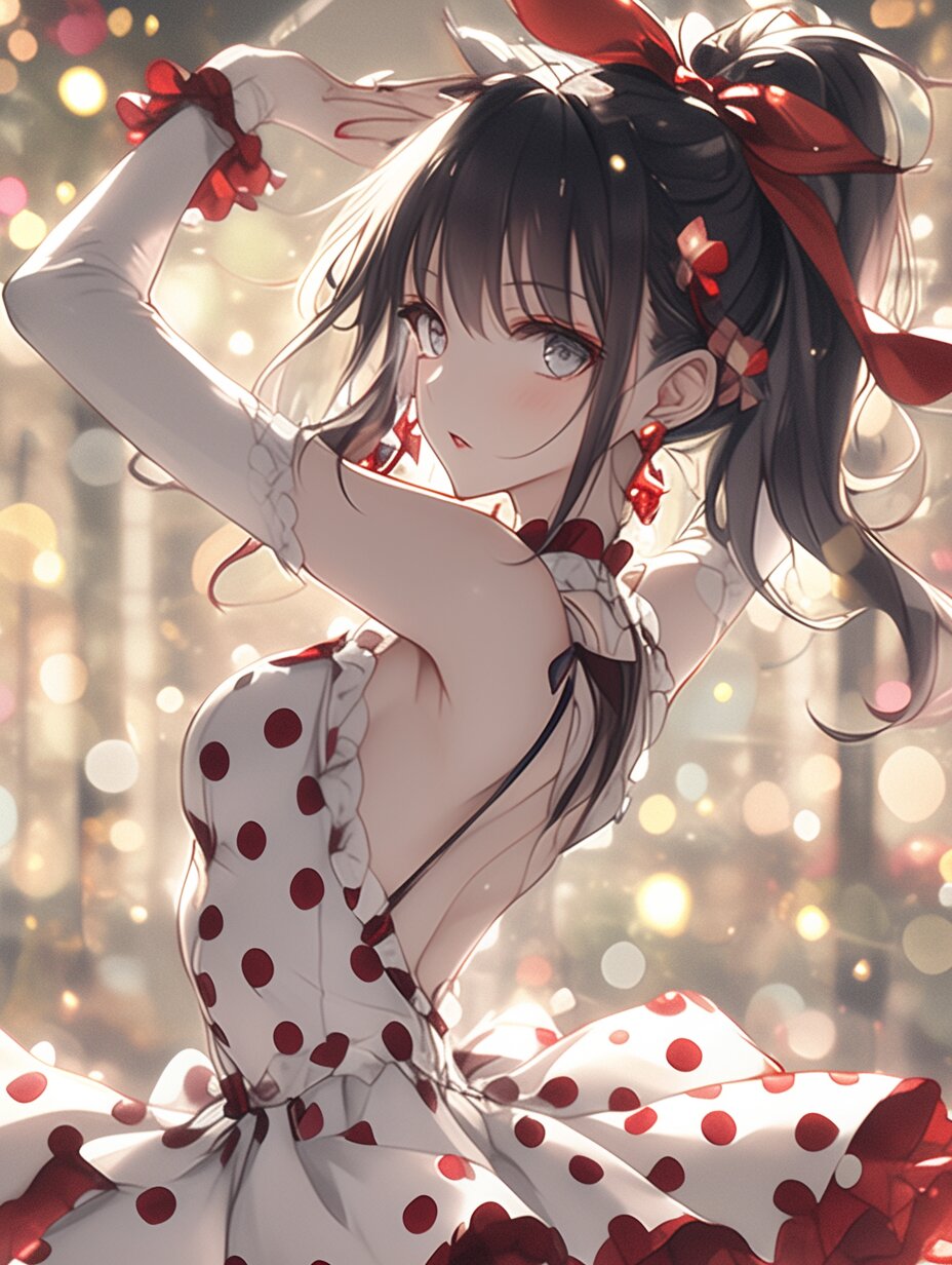 beautiful lady, Black hair, ponytail, red ribbon, big eyes, white dress with red polka dots, 昭和レトロ, dance