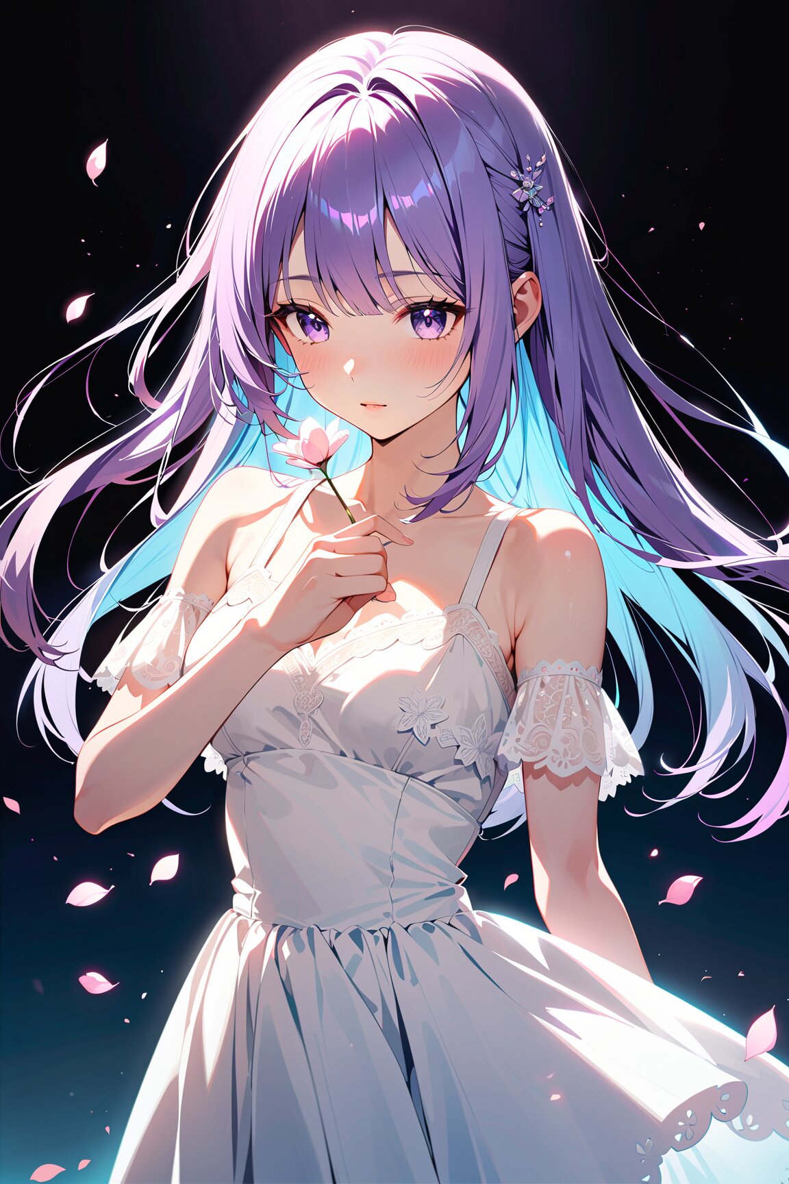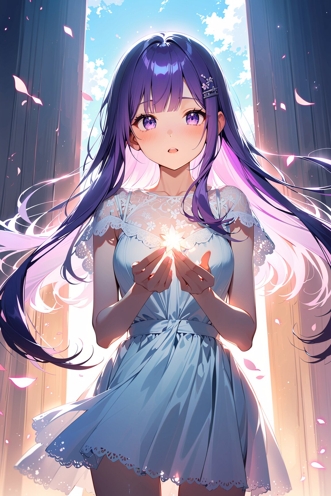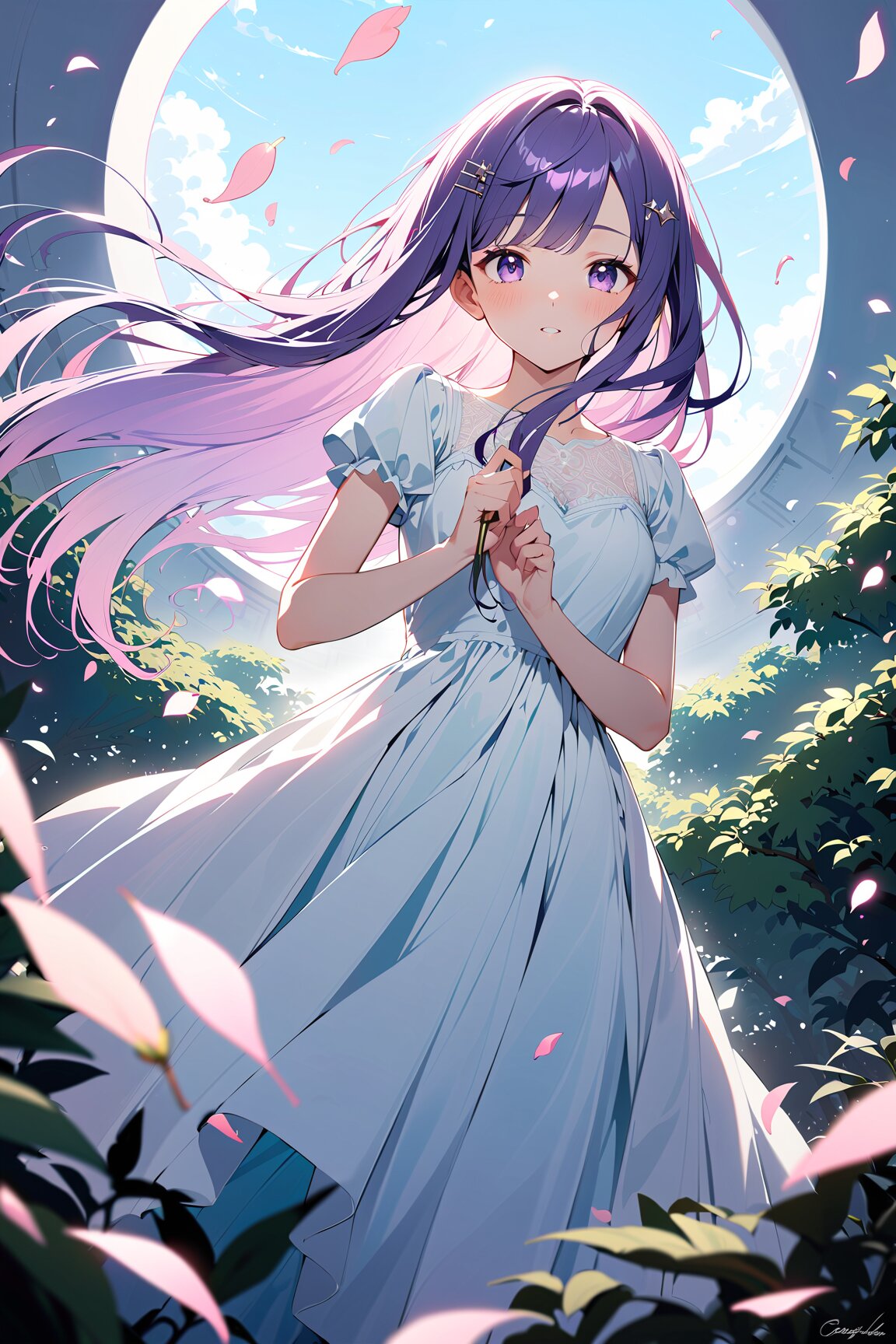 cute anime girl, standing under a clear spring sky, soft morning sunlight, diffused backlight shining through her long straight bluish purple hair with light blue inner highlights, wearing a light white one-piece dress with delicate lace and small pink ribbons, hairpin shaped like a star, holding a small cherry blossom petal gently, pastel color tones, muted colors, soft color palette, slightly misty spring background, floating sakura petals, glowing ambient light, dreamy atmosphere, delicate and emotional expression, ephemeral feeling, masterpiece, ultra-detailed, anime style hair color is bluish purple with light blue inner highlights, no pink colors, no pink hair