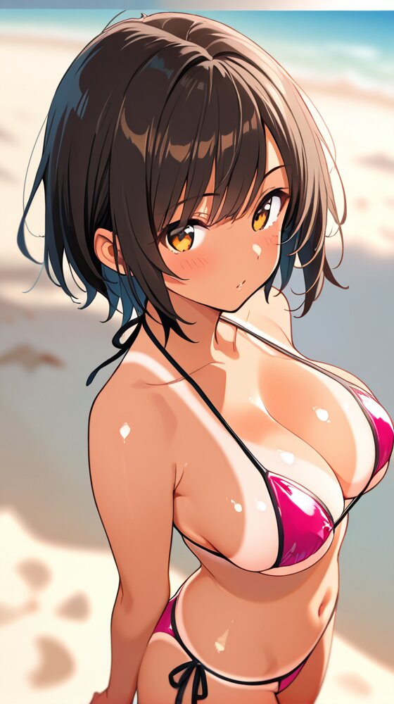 {best quality}, {very aesthetic}, {ultra-detailed}, {best illustration},Extremely detailed face, dynamic angle, blurry background, 1 girl, beach , shiny micro bikini, cowboy shot, from above, focus breast, bikini tanline