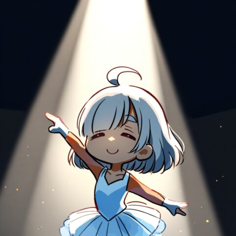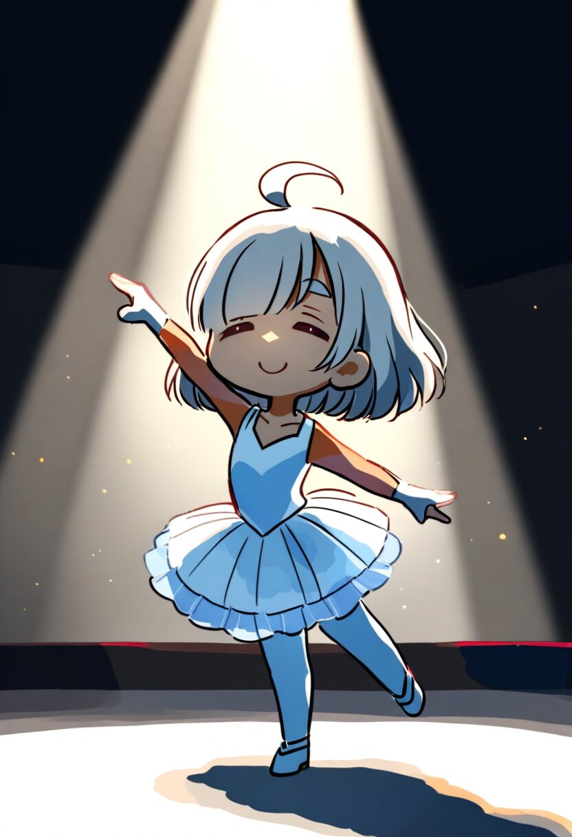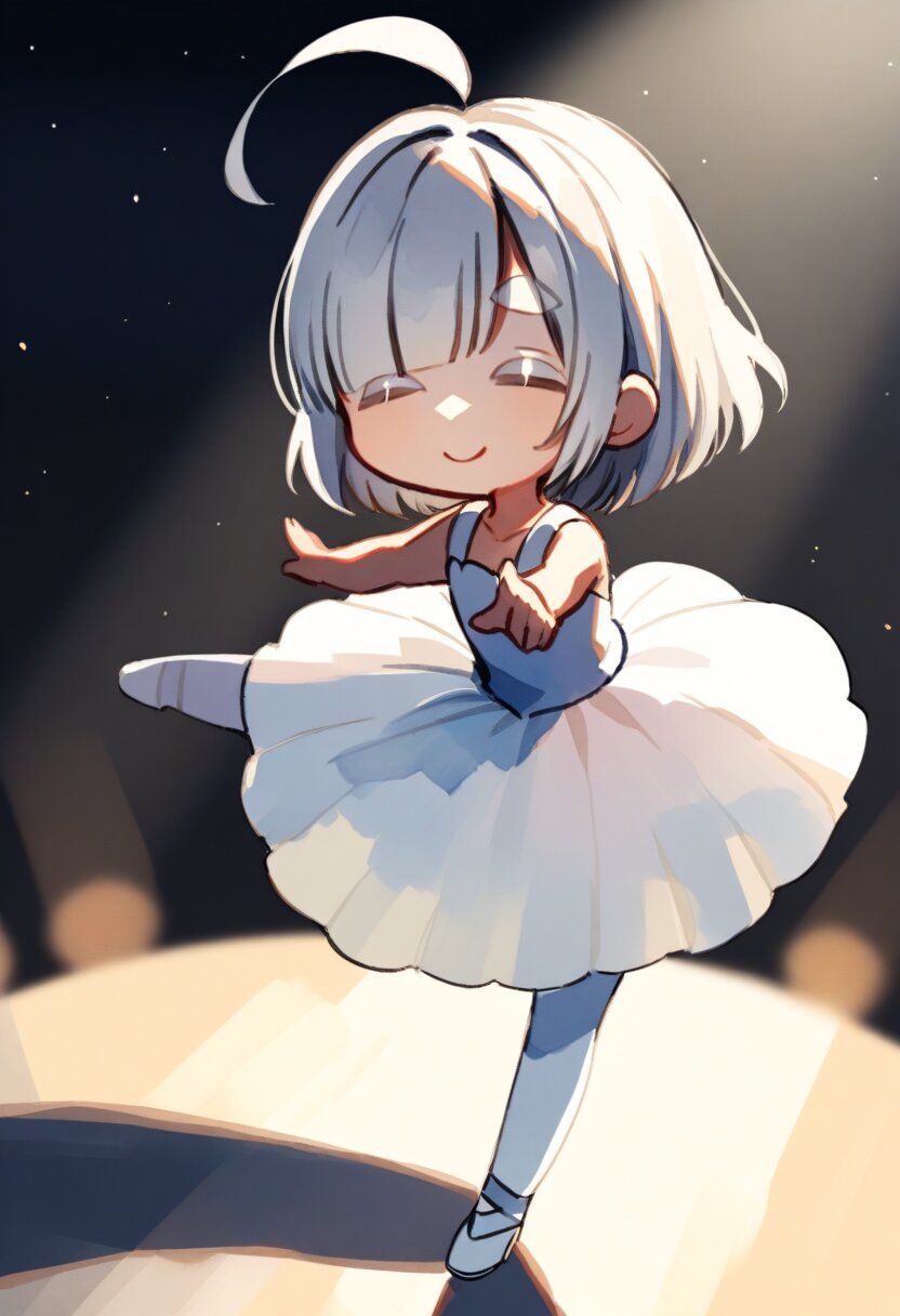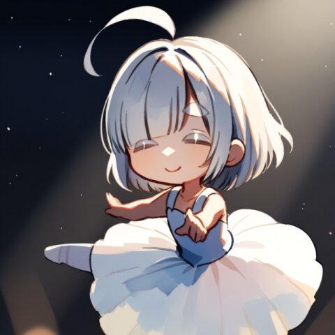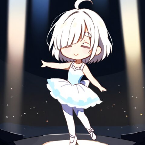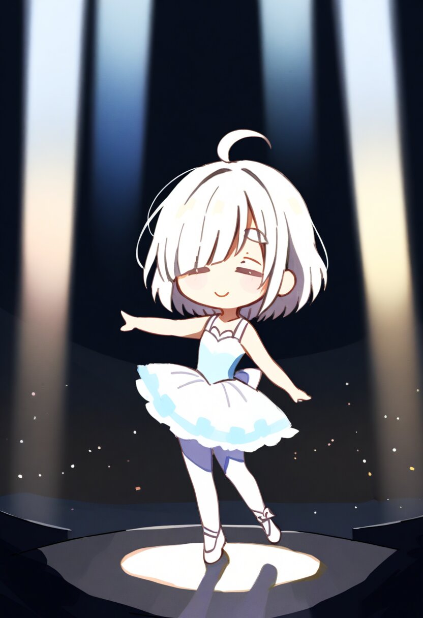 <lora:inmnstylexl:1>, best quality, masterpiece, very aesthetic, watercolor painting, general, chibi, 1girl, 10 years old, (bright white hair), short hair, blunt bangs, white thick eyebrow, white colored eyelashes, (hair over one eye), ahoge, smile, white ballet wear, tutu, white tights, white ballet shoes, ballet pose, stage, spotlight, closed eyes