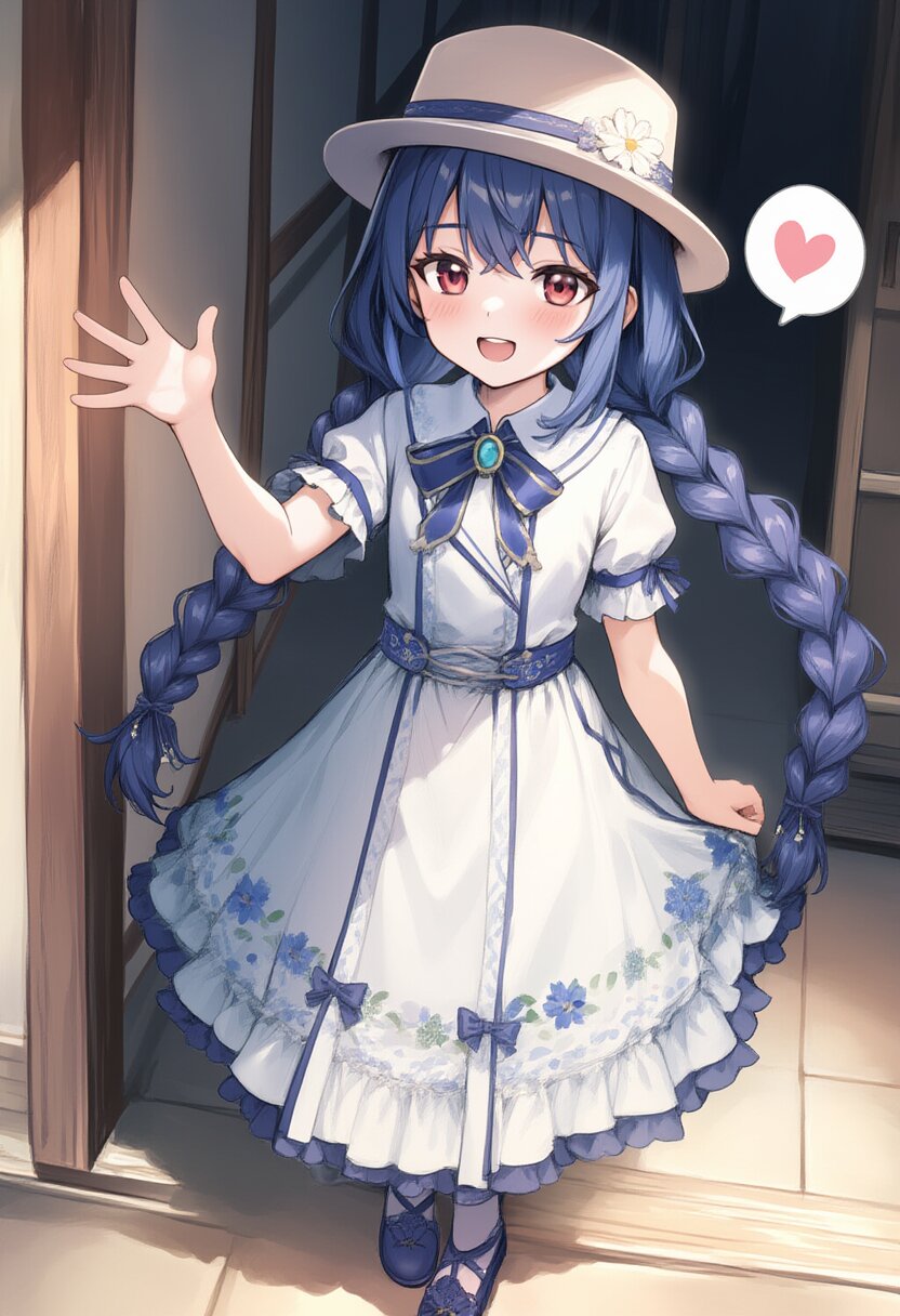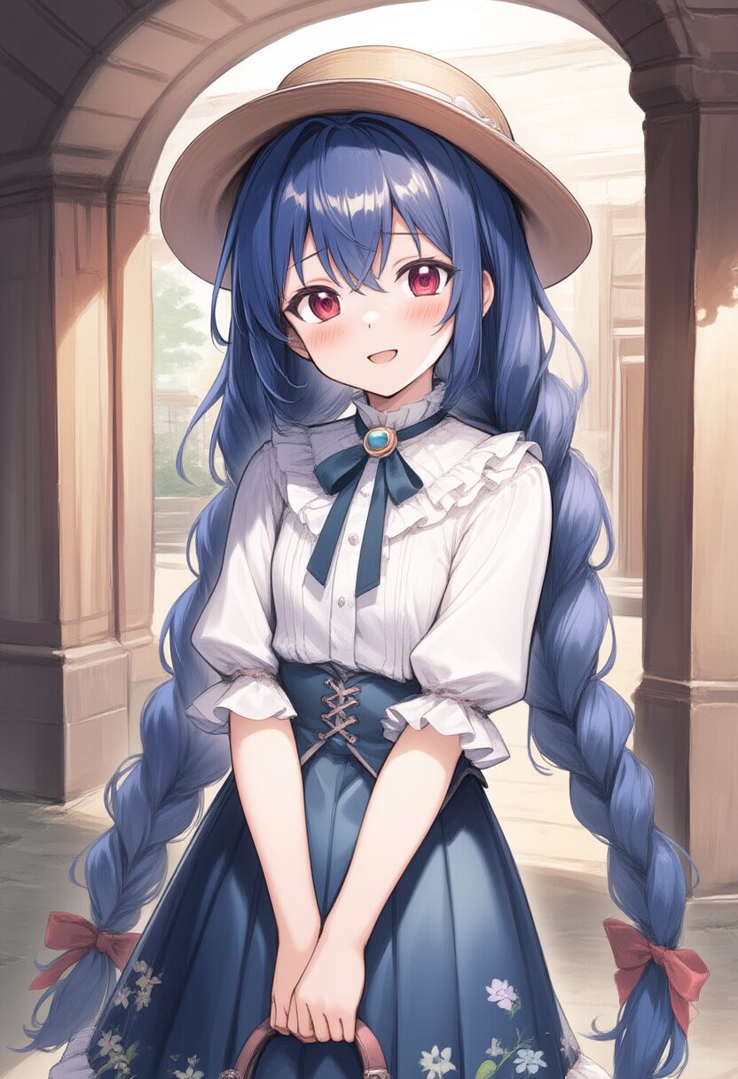 (traditional media:1.5),(sepia:1.8),masterpiece,best quality,ultra detailed,girl,short,flat chest,red eyes,{{cobalt blue hair}},{pigtails},very long hair,long half-up,{{low pigtails}},{{very long sideburns}}},braids,Floral patterns dress,Floral patterns long skirt,Short sleeve,ribbon,brooch,Boater hat,{{Showa retro}},Shopping district,full body,outstretched hand,spoken heart,, rating:general, best quality, very aesthetic, absurdres