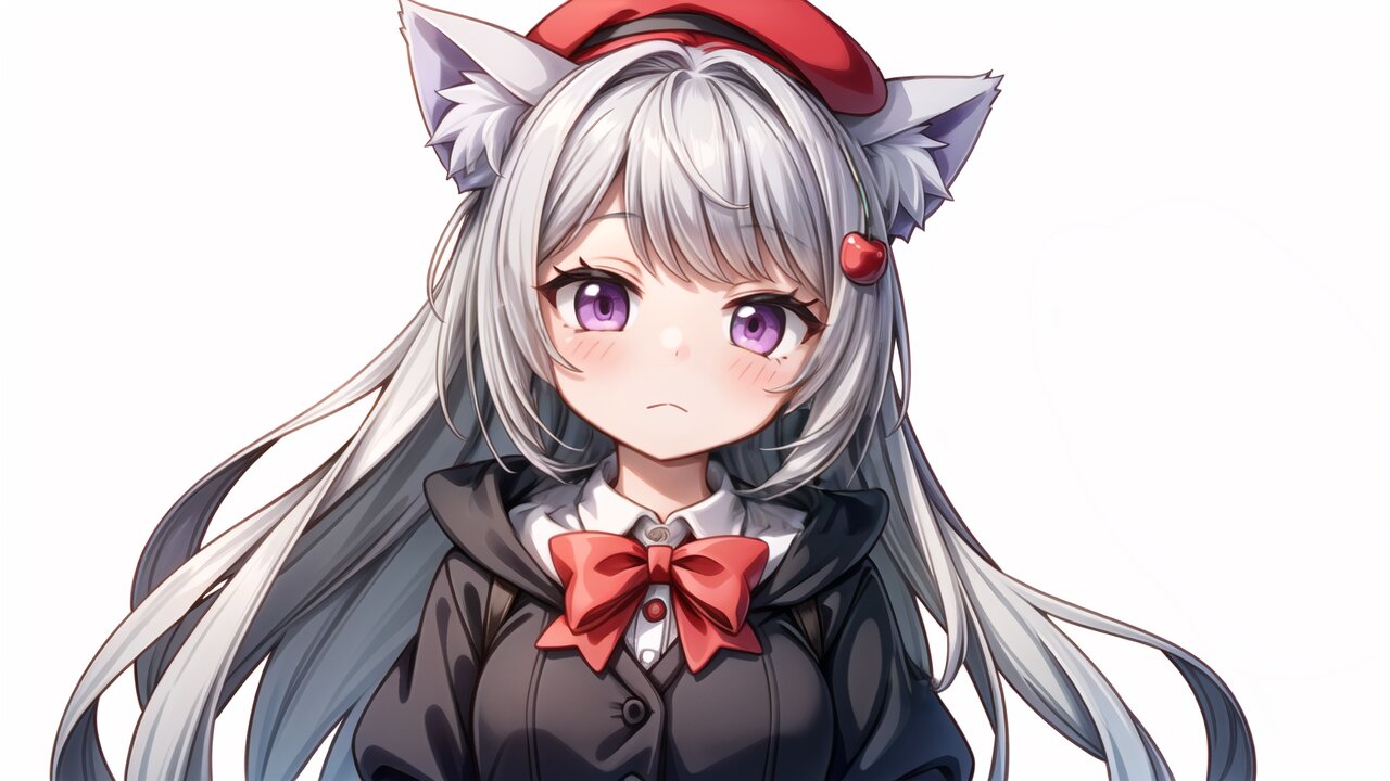 masterpiece, best quality, (official art,detailed animation),extremely detailed face, 1girl,solo, white background, smile,open mouth, (cat ears,silver hair,long hair,cherry ornament,cat eyes,Red-purple eyes:1.2), red Beret,white blouse,blown cardigan, pleated skirt,plaid skirt,grey skirt, upper body, <lora:flat2:-0.2>, <lora:EnvyCuteMix17:0.4>, <lora:GoodHands-vanilla:1>