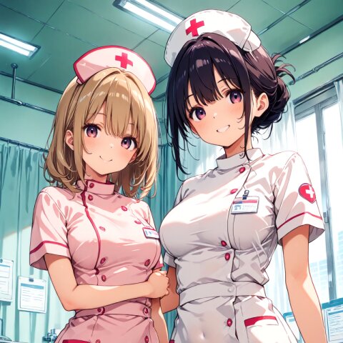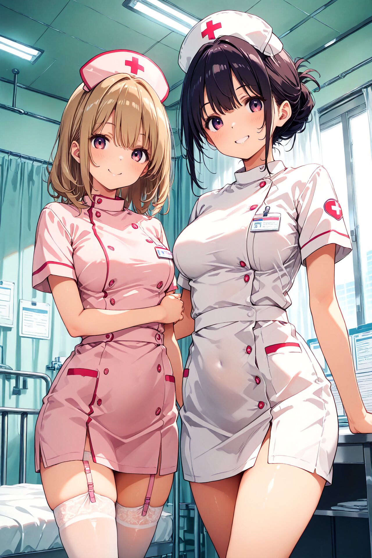 masterpiece, best quality, 2girls, nurse uniform, indoors, smile,