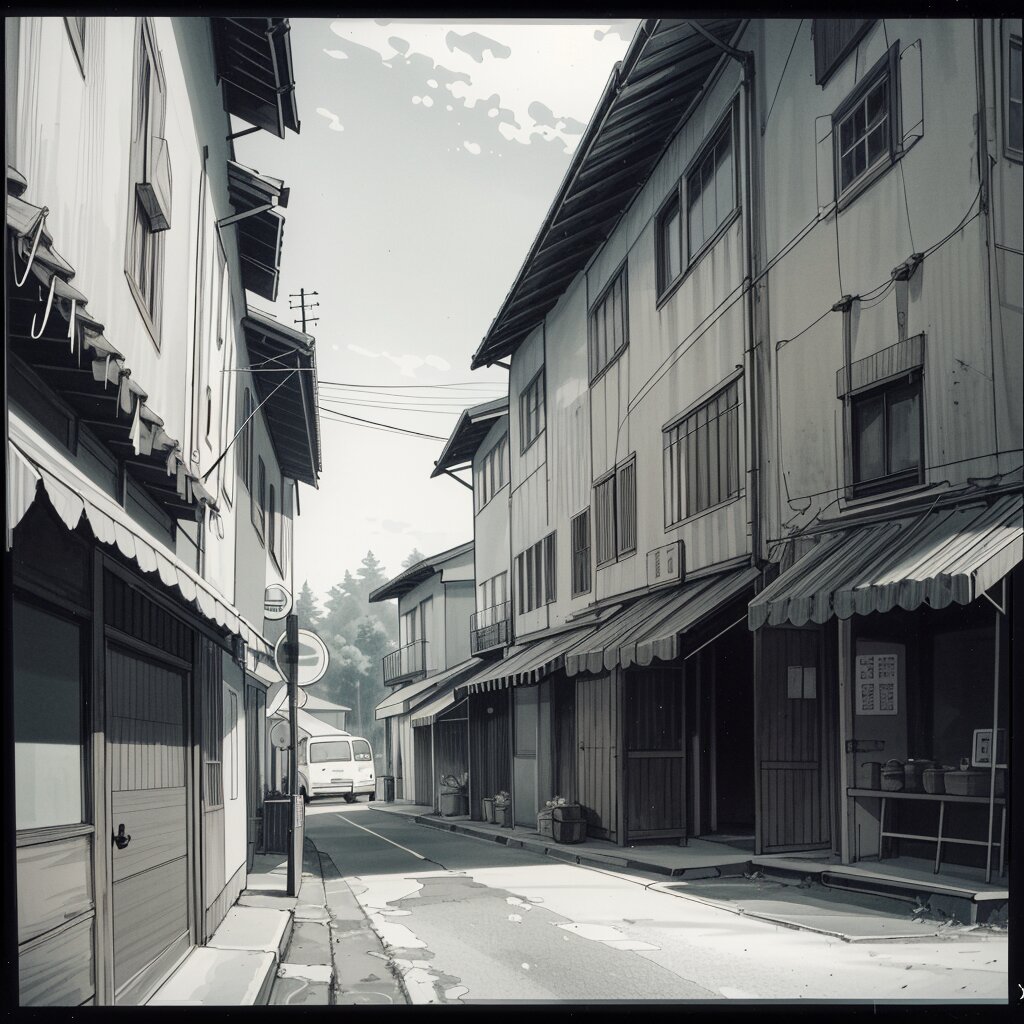 <lora:hyperdetailer_v095:0.3>,(masterpiece,absurdres), (best quality, high quality,insanely detailed:1.4),polaroid photograph,Lomography,retro style,town of the Showa Period,monochrome,