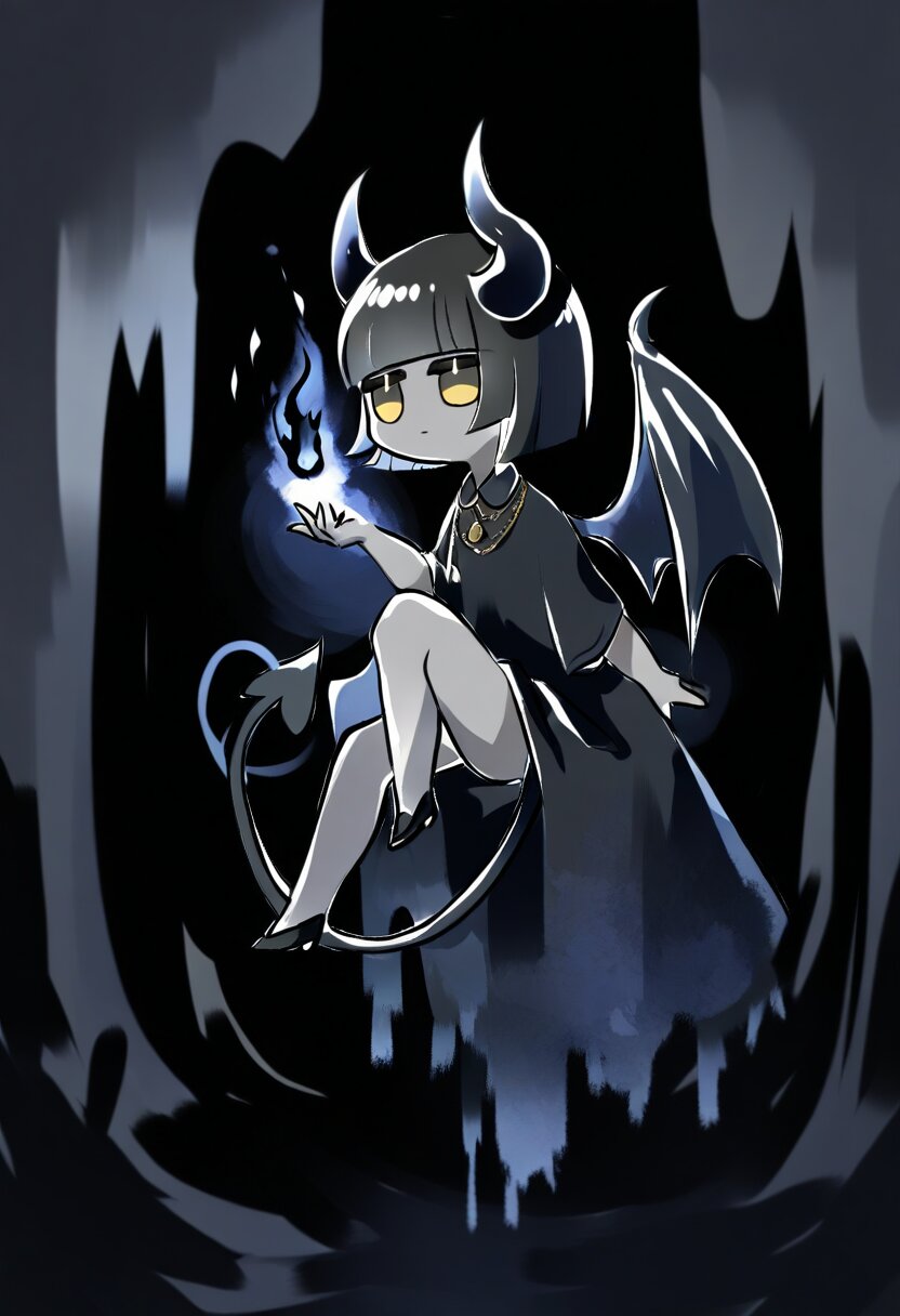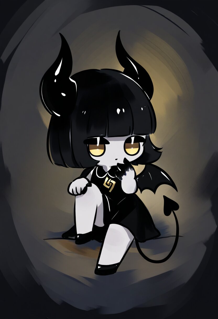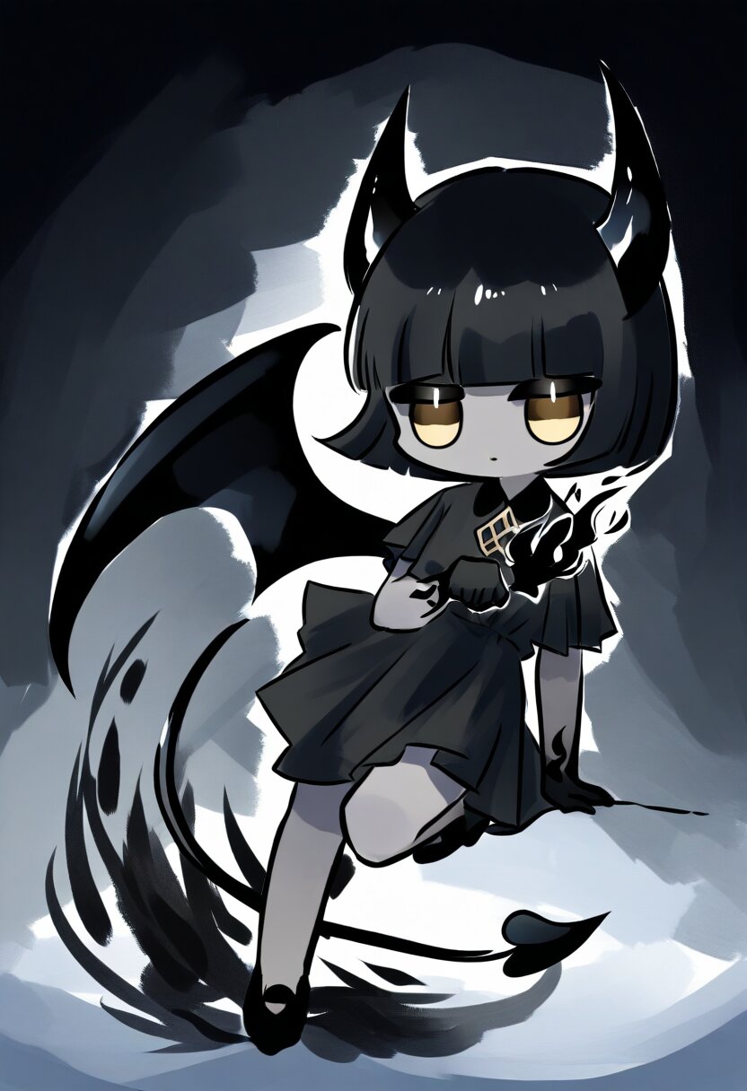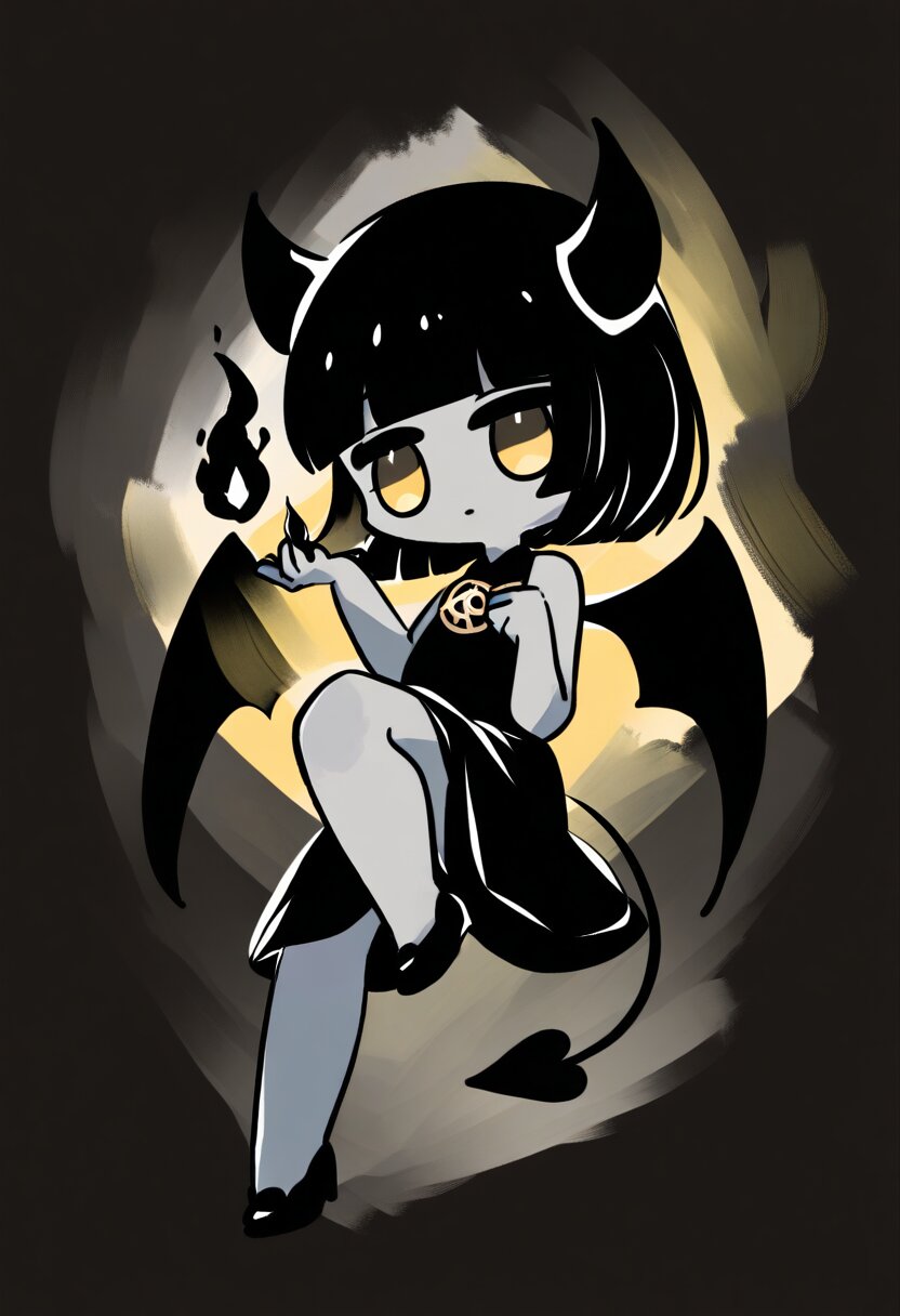 <lora:inmnsylexl4:1>best quality, masterpiece, very aesthetic, general, watercolor painting, chibi, solo, 1girl, black hair, short hair, blunt bangs, gray skin, golden eyes, black dress, devil horns, black fire on hand, black devil wings, devil tail, knee up, full body, black background