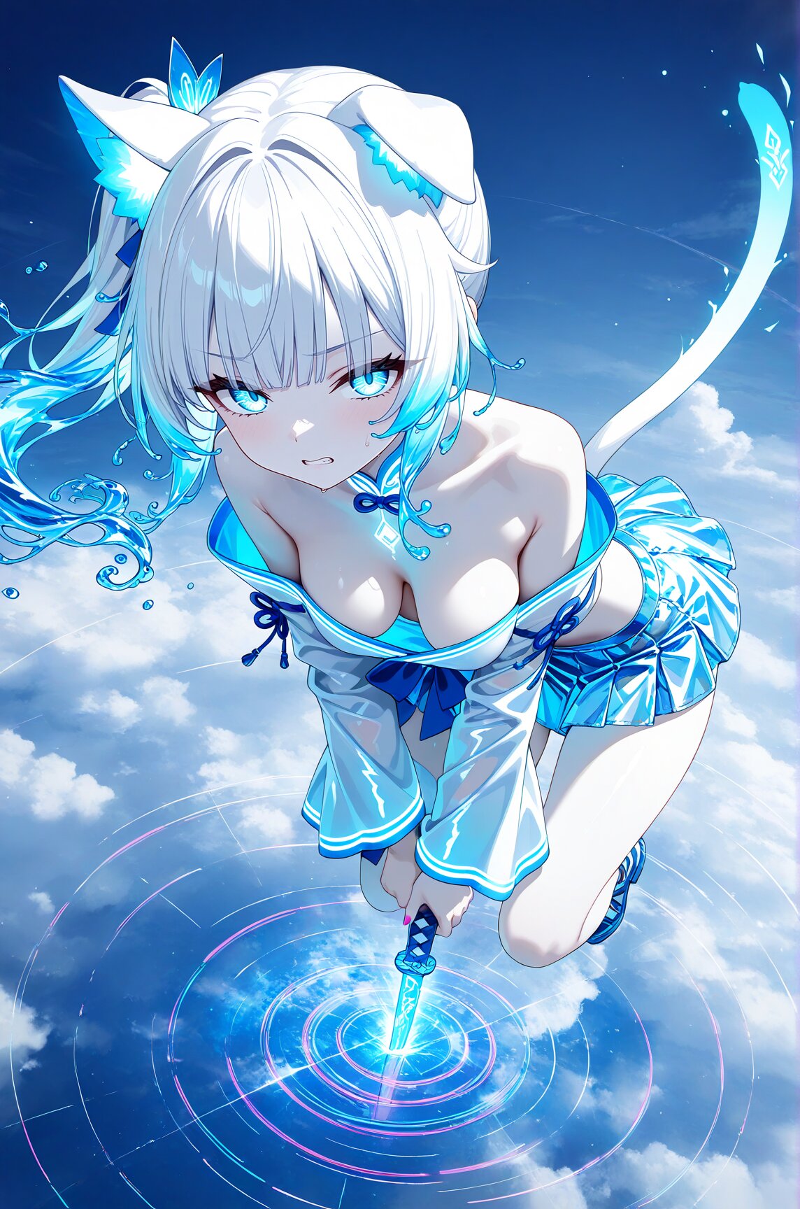 Anime illustration, CG art, 3D model, 3D rendering, 3D skin texture, high detail, depth of field, 1 person, cat ears, cat tail, hime cut, side ponytail, slanted eyes, sky blue eyes, white skin, gothic lolita, 8K, masterpiece, best quality, amazing quality, very aesthetic, (volumetric lighting), overexposed,