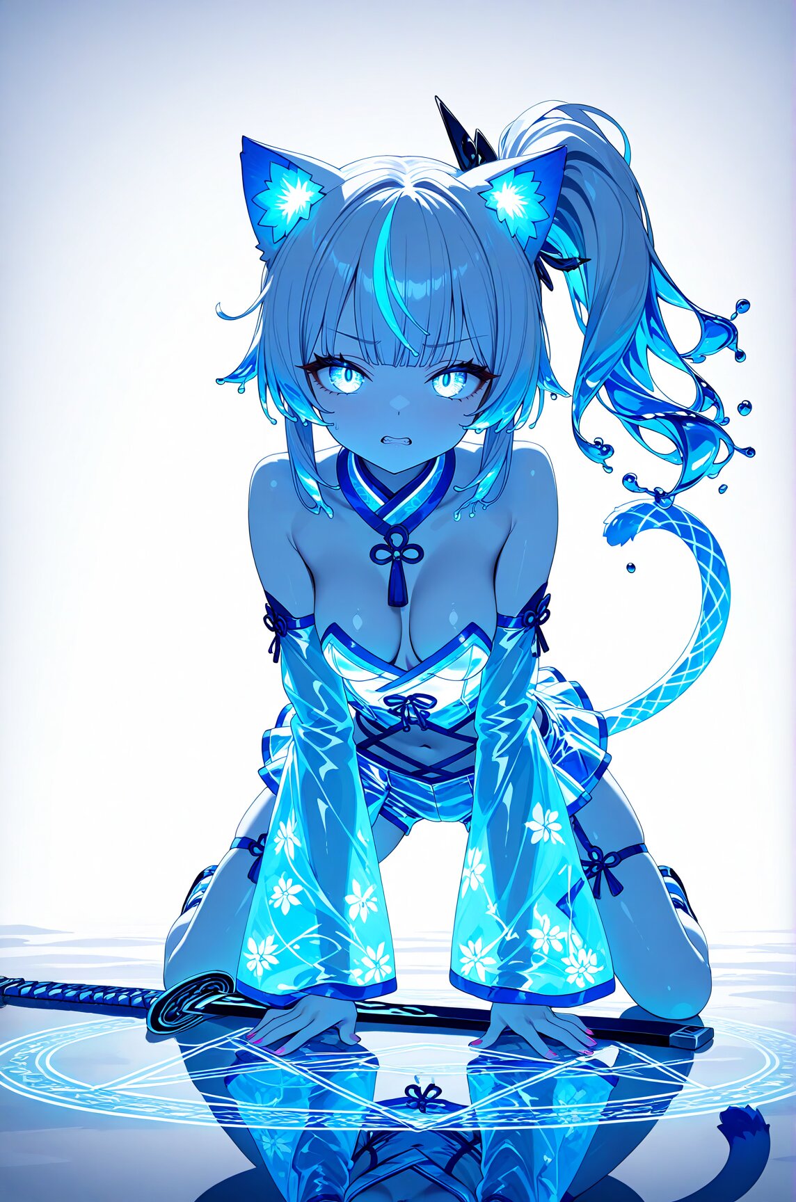 Anime illustration, CG art, 3D model, 3D rendering, 3D skin texture, high detail, depth of field, 1 person, cat ears, cat tail, hime cut, side ponytail, slanted eyes, sky blue eyes, white skin, gothic lolita, 8K, masterpiece, best quality, amazing quality, very aesthetic, (volumetric lighting), overexposed,