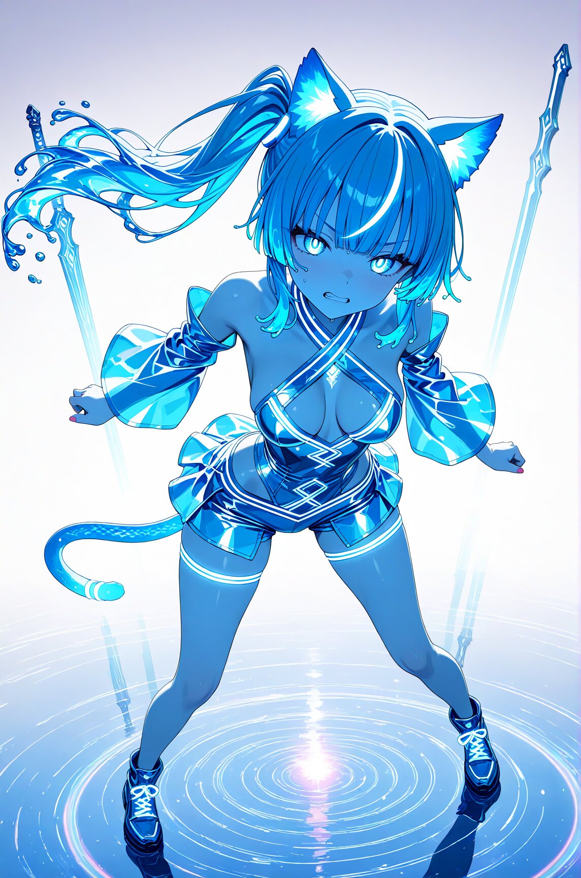 Anime illustration, CG art, 3D model, 3D rendering, 3D skin texture, high detail, depth of field, 1 person, cat ears, cat tail, hime cut, side ponytail, slanted eyes, sky blue eyes, white skin, gothic lolita, 8K, masterpiece, best quality, amazing quality, very aesthetic, (volumetric lighting), overexposed,