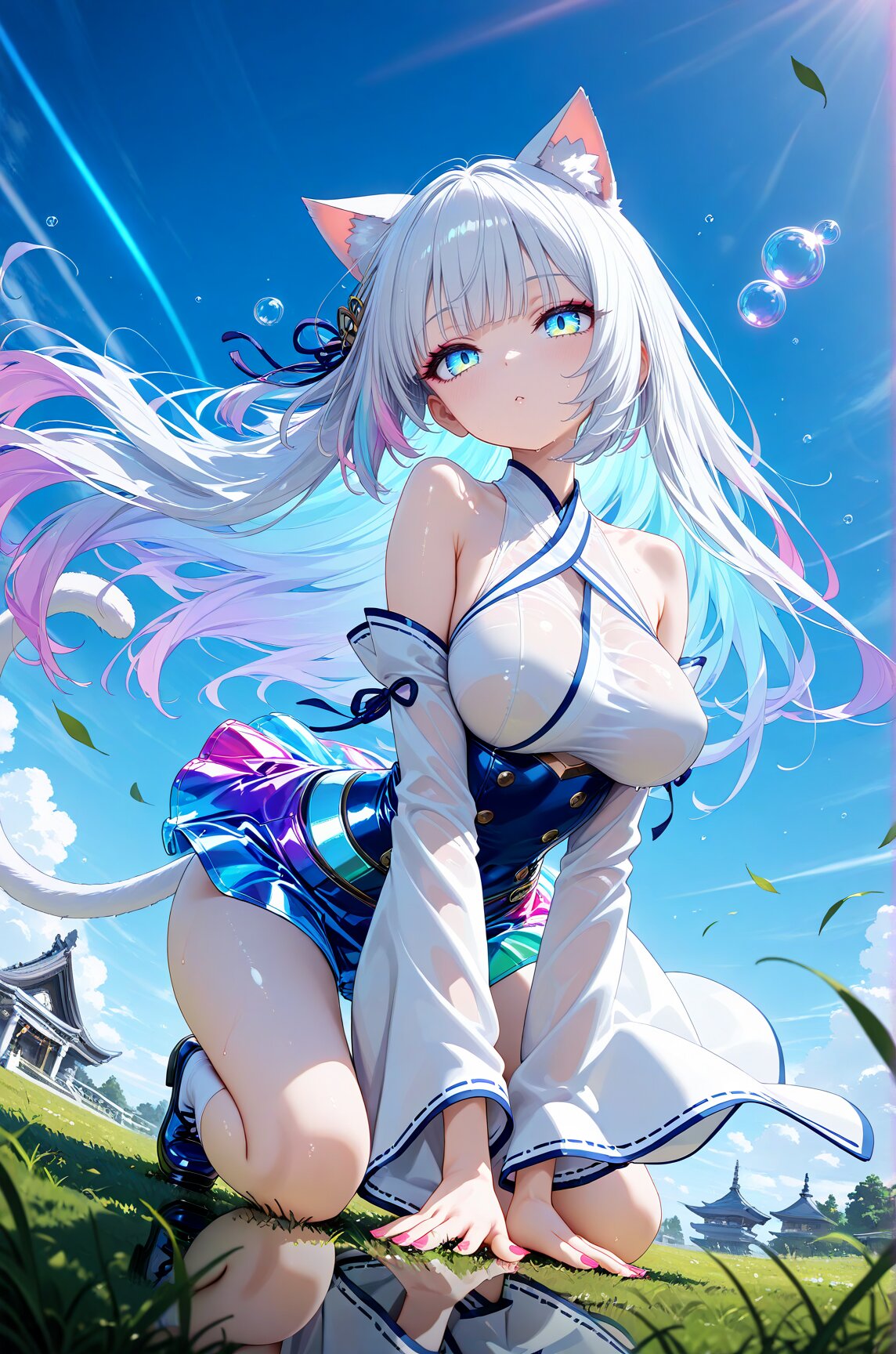Anime illustration, CG art, 3D model, 3D rendering, 3D skin texture, high detail, depth of field, 1 person, cat ears, cat tail, hime cut, side ponytail, slanted eyes, sky blue eyes, white skin, gothic lolita, 8K, masterpiece, best quality, amazing quality, very aesthetic, (volumetric lighting), overexposed,