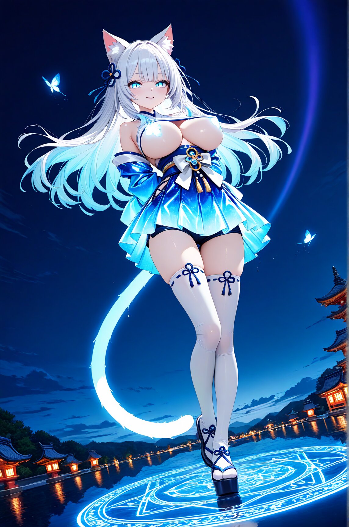 Anime illustration, CG art, 3D model, 3D rendering, 3D skin texture, high detail, depth of field, 1 person, cat ears, cat tail, hime cut, side ponytail, slanted eyes, sky blue eyes, white skin, gothic lolita, 8K, masterpiece, best quality, amazing quality, very aesthetic, (volumetric lighting), overexposed,