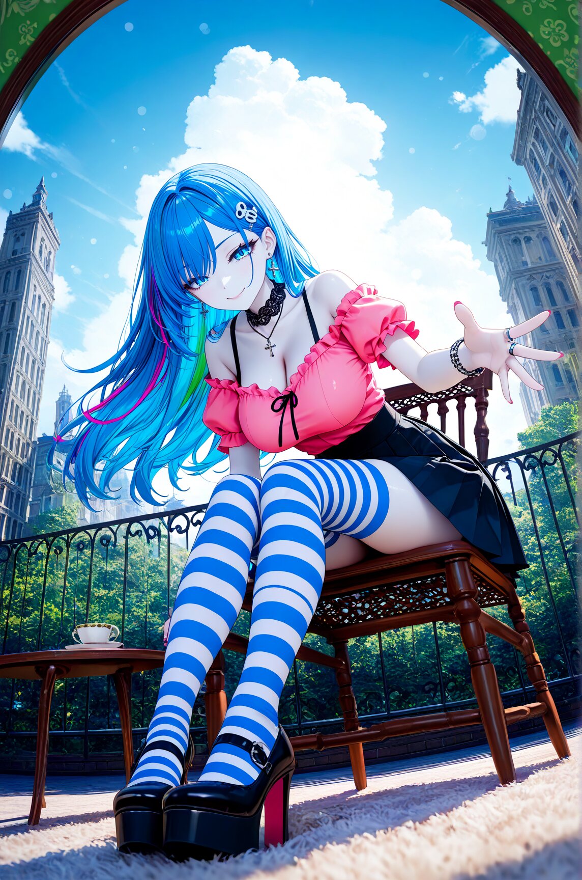Anime illustration, CG art, 3D model, 3D rendering, 3D skin texture, high detail, depth of field, 1 person, cat ears, cat tail, hime cut, side ponytail, slanted eyes, sky blue eyes, white skin, gothic lolita, 8K, masterpiece, best quality, amazing quality, very aesthetic, (volumetric lighting), overexposed,
