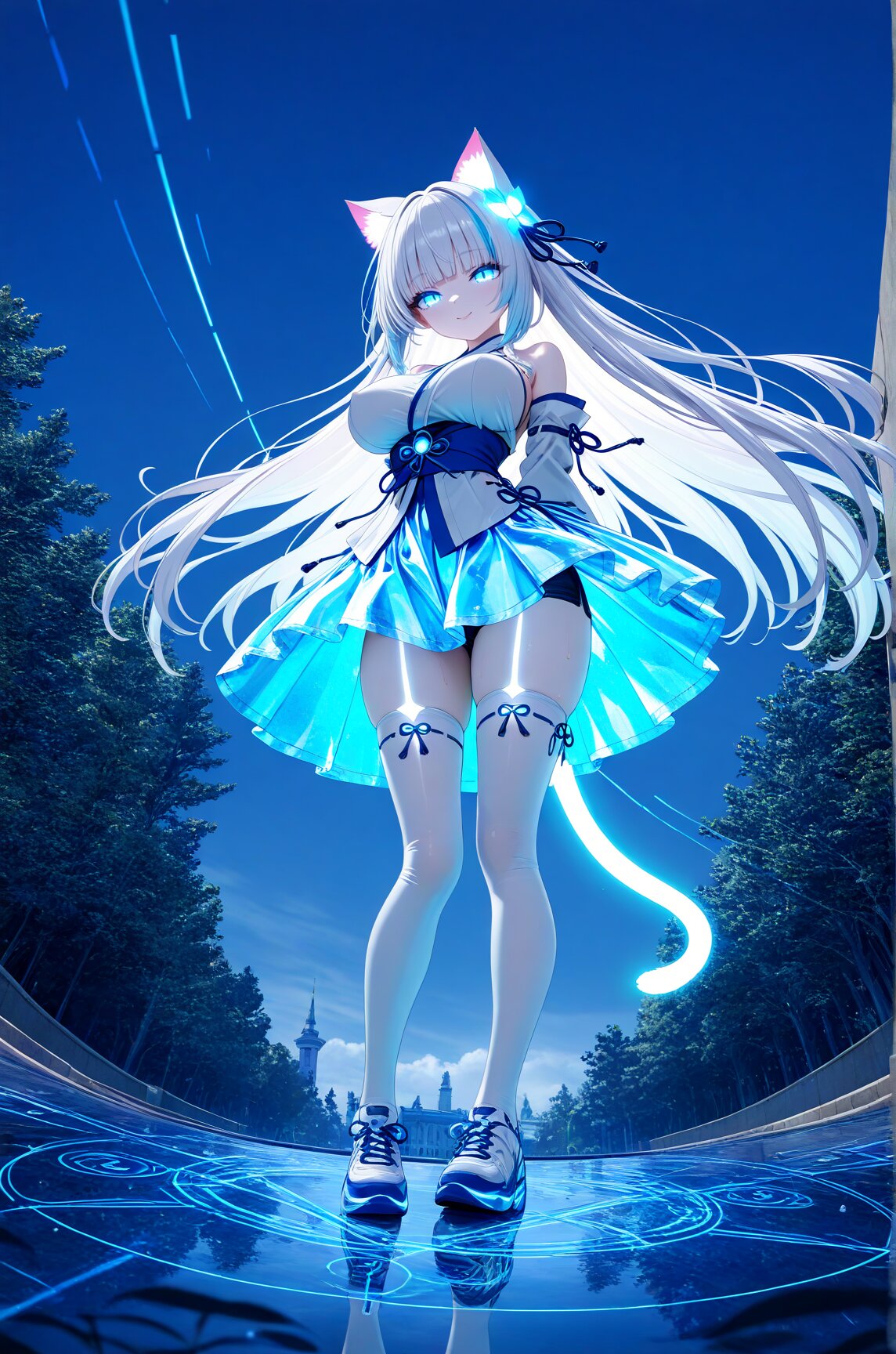 Anime illustration, CG art, 3D model, 3D rendering, 3D skin texture, high detail, depth of field, 1 person, cat ears, cat tail, hime cut, side ponytail, slanted eyes, sky blue eyes, white skin, gothic lolita, 8K, masterpiece, best quality, amazing quality, very aesthetic, (volumetric lighting), overexposed,