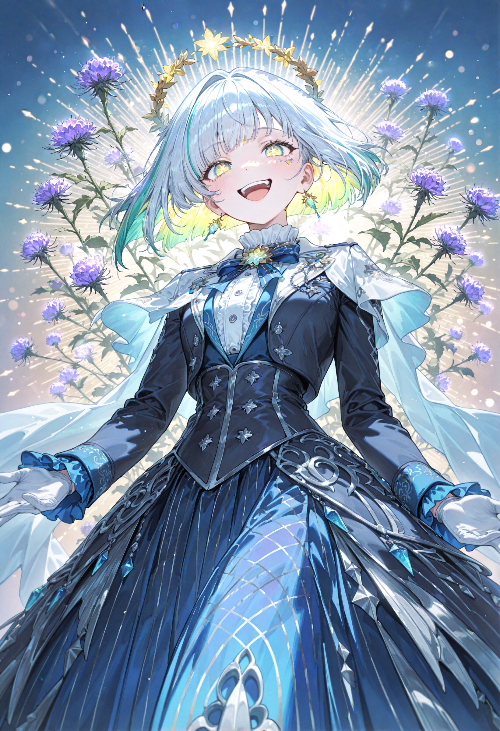 long shot from below, looking down , 1girl, ((inverted bob)), (((detailed anime face))),((beautiful detailed face)), gray hair, ((colorful hair)),((streaked hair)), beautiful citrine eyes,(citrine eyes:1.3), multiple-colored hair, (colorful hair:1.4), cute face, sparking eyes, eye shadow,, flower halo, collar, white cloth, (extremely delicate and beautiful fabric), detailed clothes,, cool, angel smile haughty face smile (emotional:1.1), (crazy smile:1.0),(open mouth:1.2), (thistle:1.0), (surrounded by thistle:1.1) , (high saturation:1.2), (simple earth color background:1.0) , evening dappled moonlight winter atmosphere, depth of field, bokeh, in thistle garden, super fine concept art, hard surface, 8K, unreal engine, masterpiece, best quality, amazing quality, very aesthetic, absurdres you can add scenery, (volumetric lighting), To make the background more distinctive. professional art lots of details, , overexposure, shiny-glistening, (watercolor style:0.5), (pastel color style:0.5) <lora:noline (1):-0.5> <lora:sdxl2-flat2-512b:-1.0> <lora:facelightup_xl_v10:0.5>