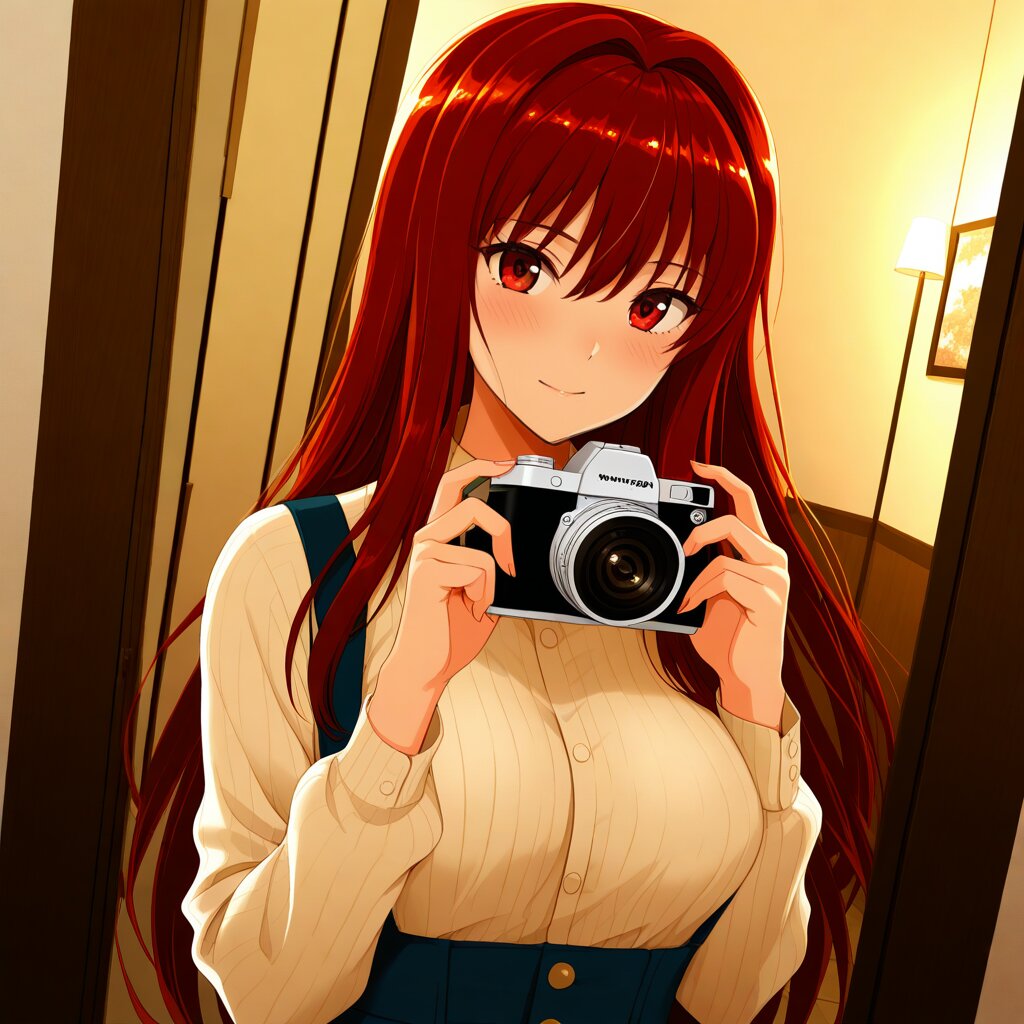 masterpiece,best quality,amazing quality,very aesthetic,absurdres,newest,highres,okashirastyle,8k,extremely detailed CG unity 8k wallpaper,(perfect face:1.2), masked man,1girl,27yo,long_hair,brown_hair,red_eyes,hair_between_eyes,very_long_hair,brown_eyes,red_hair,floating_hair,hair_intakes,straight_hair,shiny_skin,medium_breasts,1970's clothes,smile,holding camera,Showa Retro style,selfie,In the heart of Tokyo's bustling Shibuya district, a charming caf� transports its patrons to the Showa era with its retro ambiance. Through the glass door, one can see a scene straight out of the past: patrons wearing vintage clothing, sipping tea from delicate porcelain cups, and chatting animatedly over traditional Japanese sweets. The walls are adorned with nostalgic posters and advertisements, while soft jazz music plays in the background. In the corner, two friends laugh as they share a vintage comic book under the warm glow of an antique table lamp.