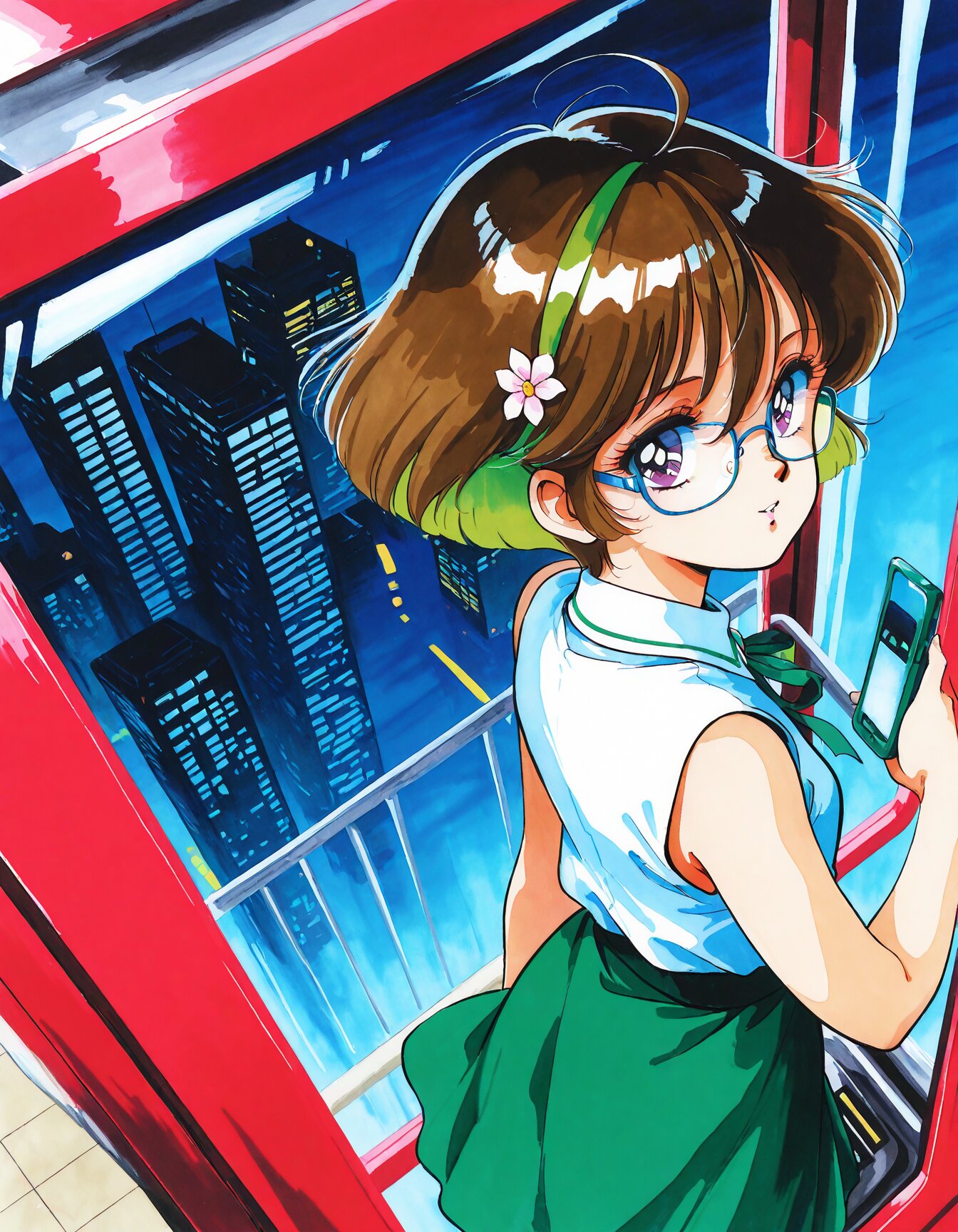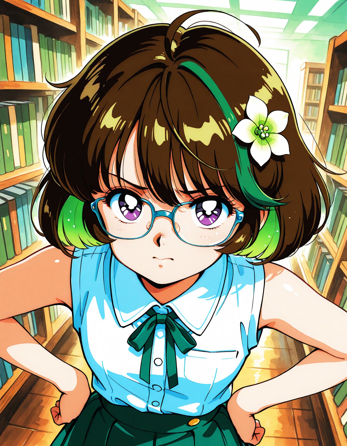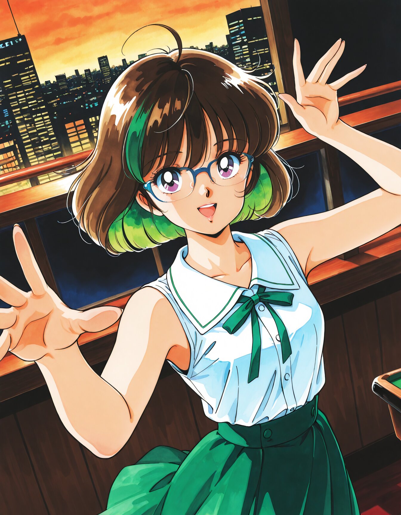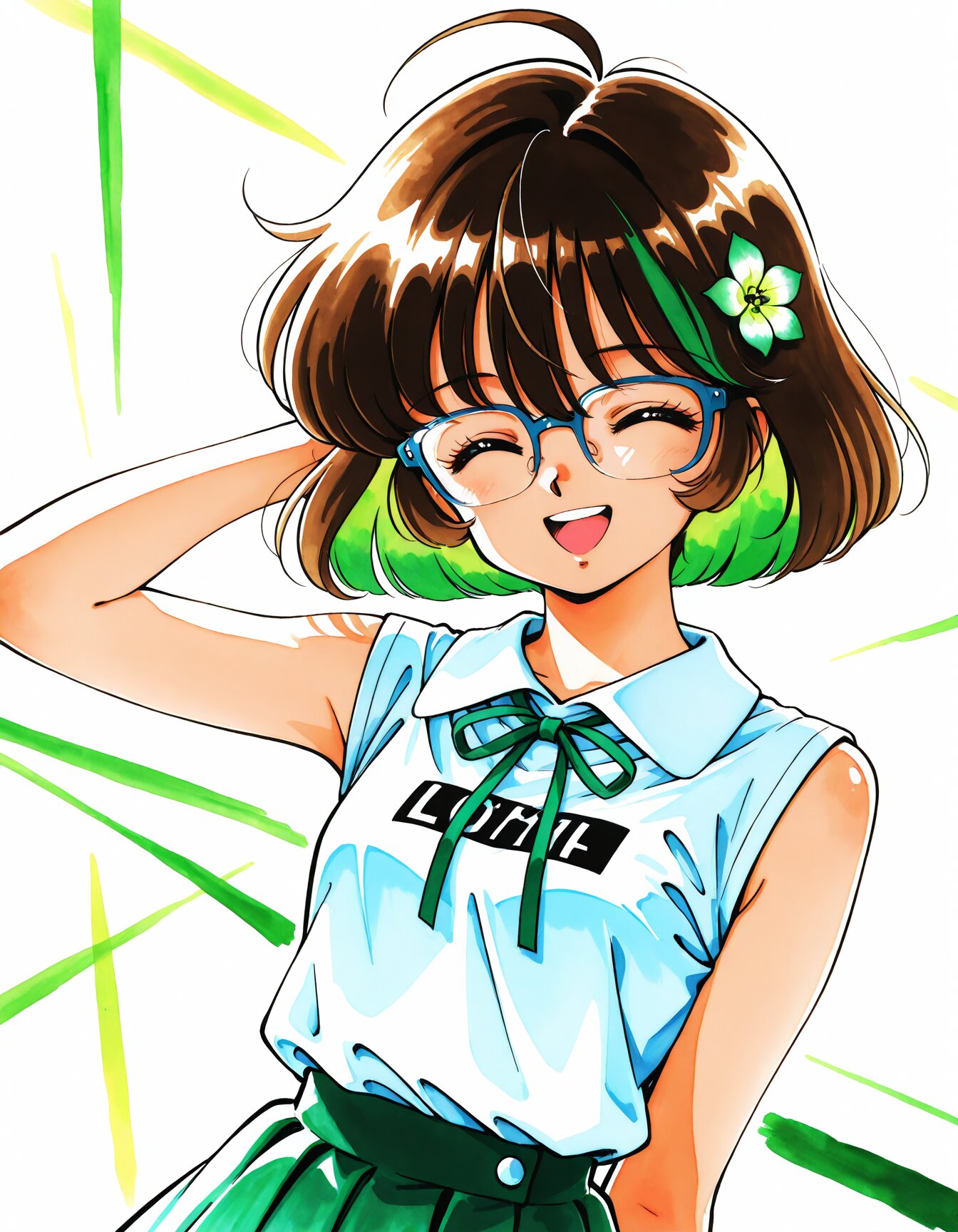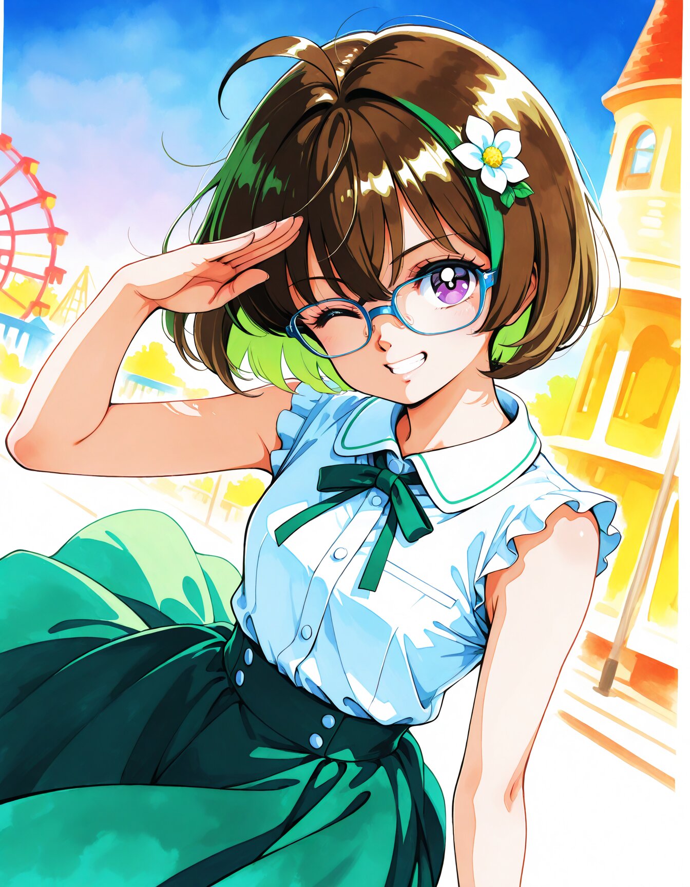 female,(wink:1.2),looking_at_viewer,solo,(shorthair,brown hair:1.3),(green streaked hair:1.5),closed eyes,purple eyes,detailed eyes,(hair detail:1.2),facial detail, (ahoge:1.2),(glossy hair:1.3), (bangs bangs:1.2),hair between eyes:1.1,(small breasts:1.2),(green striped bangs:1.1),(hair_flower:1.2),(details of glasses:1.1),blue-framed_eyewear,(green hair:1.2),(green bangs:1.1),thin green ribbon at the neck,(emerald color inner hair color:1.2),sleeveless shirt with white collar,sleeveless white shirt,(flying hair:1.2),thin green ribbon at the neck,green skirt,(looking_at_viewer:1.1),front view,dynamic_angle, traditional media,(watercolor:1.3),1980s (style),retro artstyle,<lora:Adachi_XL:0.6>,<lora:TShirtDesignRedmondV2-Tshirtdesign-TshirtDesignAF:1>,T shirt design,TshirtDesignAF,salute,serious,grin,amusement_park,