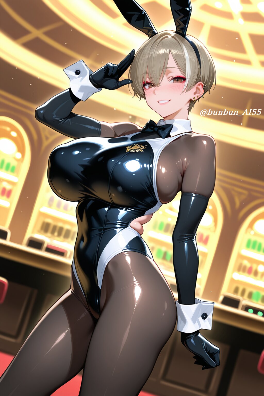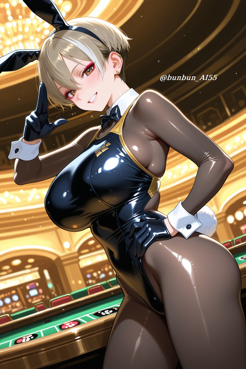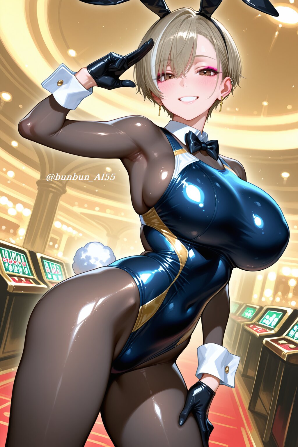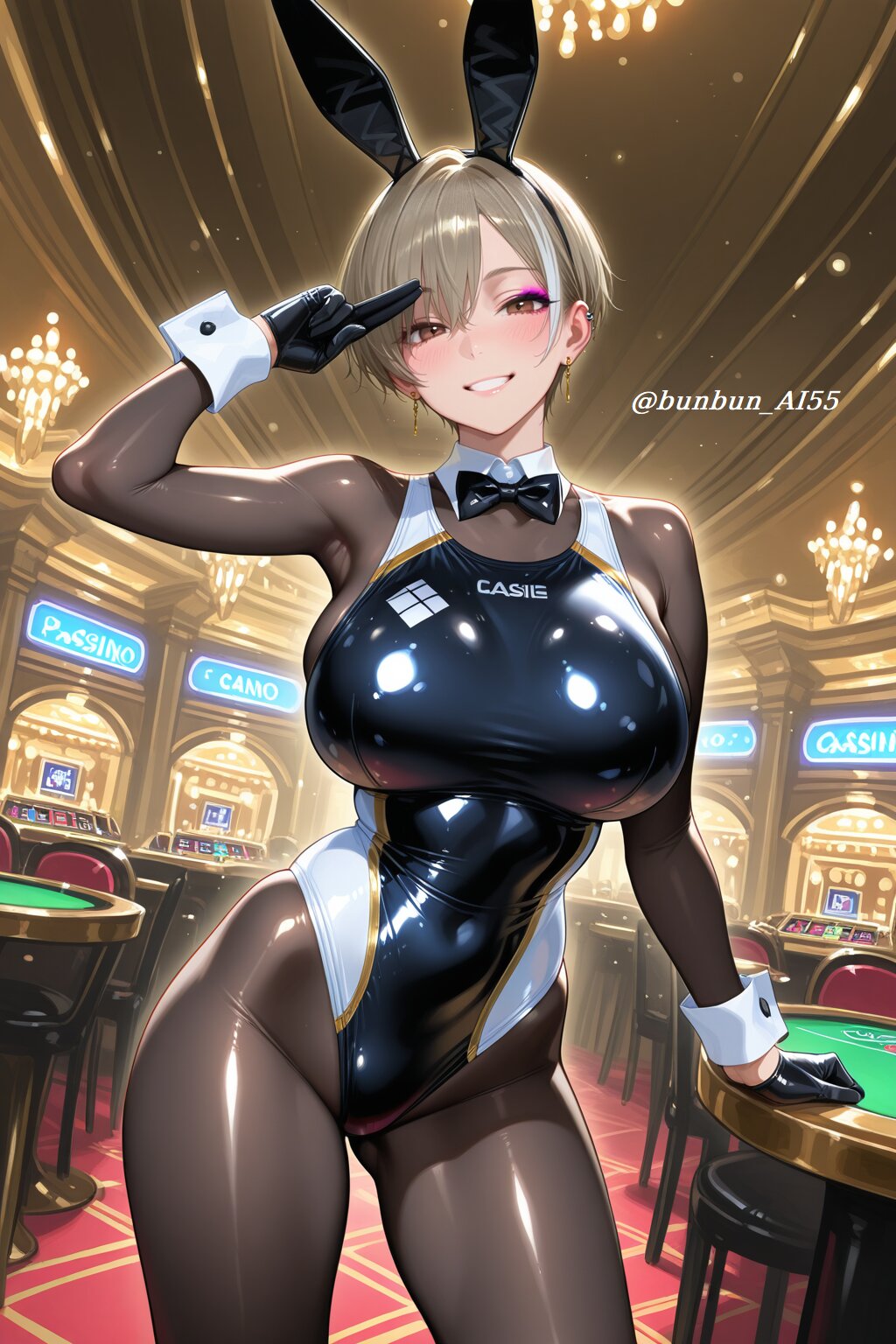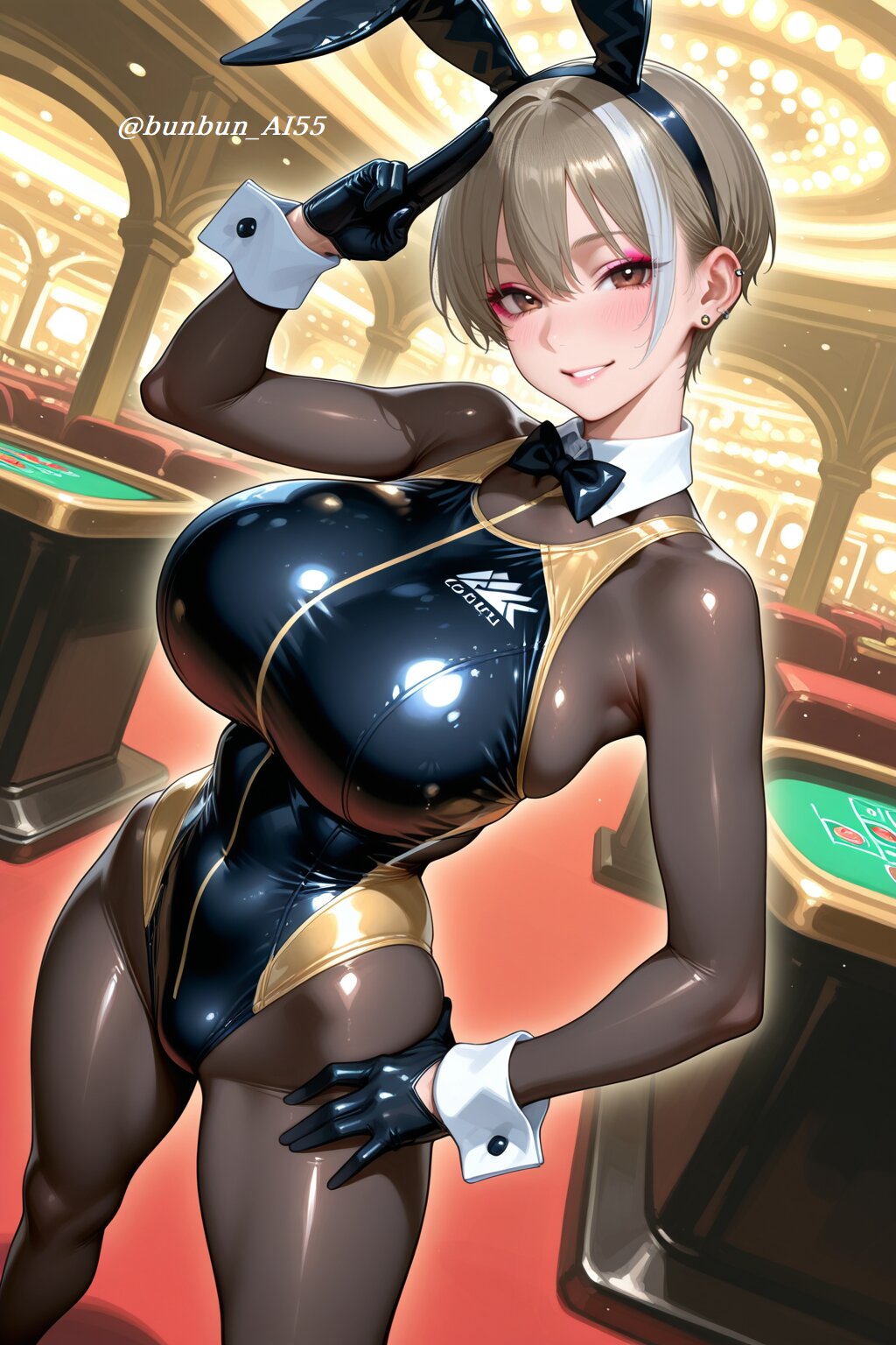 HDR, 8K,masterpiece, best quality, amazing quality, very awa, very aesthetic, absurdres, newest, detailed eyes, realistic eyes, realistic body, realistic, highres, add detail, sharp detailes, sharp lines, sharp focus, real skin, no lineart, glamorous atmosphere, BREAK perfect lighting, professional lighting, (1girl, beautiful tall girl, 18year old), (boyish, kawaii, idol), (japanese face, slim face, small face, cute face, detailed face, brown eyes, makeup), (looking at viewer, seductive smile, blush), (brown hair with silver streaks:1.5, very short hair), (jewelry, piercing, earrings), (rabbit ears), nsfw, (huge breasts, pointy breasts), long legs, (perfect hands), (shiny skin), (slim body, athletic body), (wearing a gold competition swimsuit over bodystocking, intricate clothing design), (bowtie, satin gloves with wrist cuffs), (light reflections), (shiny, glossy, luster), (tight fit), (glossy texture), (standing, legs apart, dynamic pose), (making a two-finger salute, cute pose), (detailed background, standing in a casino, elegant), (from side | straight-on), (bust-up shot, medium shot, dynamic angle, dutch angle),