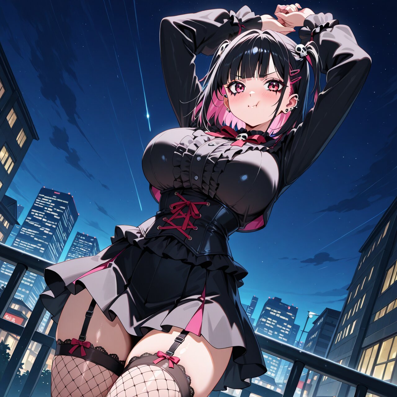 (1girl), young female, BREAK,Mineral makeup, (makeup), (heavy eye shadow), deep makeup , , ((gothic lolita, lolita fashion)) (Sharp eyes), (pink eyes), hime cut, blunt bangs, ((Bob hair:1.3)), ((black hair)), ((pink inner hair:1.2)), many piercings, (pink hair clip) BREAK, slim, small waist, hyper breasts BREAK, Slender, narrow waist, toned body, athletic body, shiny skin, beautiful pupils Fishnet stockings, mini skirt, red ribbon Pigtails, skull hair clip, puffed cheeks, sulky expression, hands above head, clenched fists Night, city, town, Row of buildings, city lights, Front angle, BREAK, ((newest, year 2024, anime, animation, anime screen capture, anime style:1.2)) BREAK, ((masterpiece, , vibrant, very aesthetic, highly detailed, best quality, 16k:1.2))