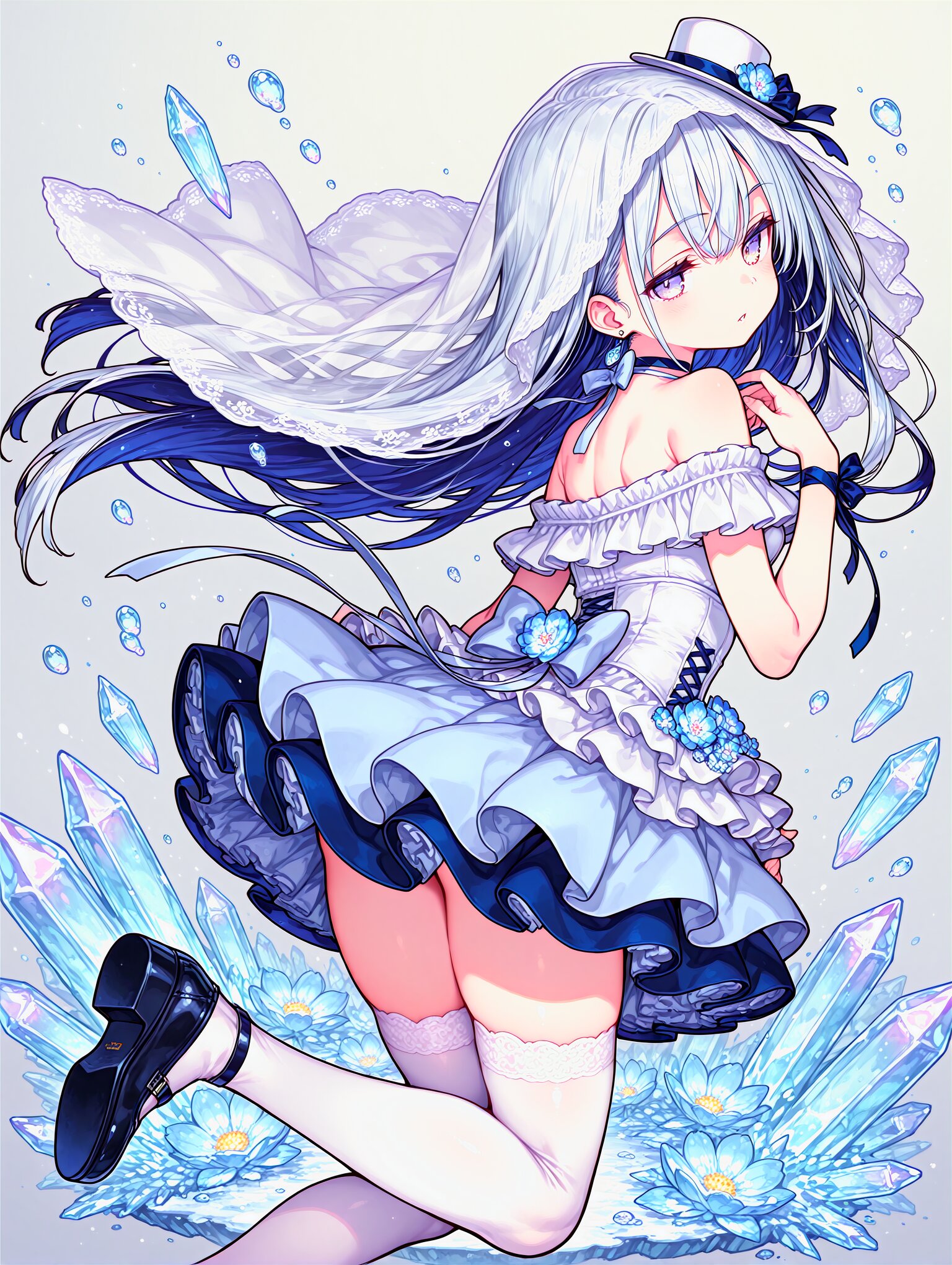 beautiful detailed background, best quality, (pale color,:1.2) feet out of frame, watercolor \(medium\), solo, collarbone, parted lips,(Expressionless:0.8), big eyes,half-closed eyes, tareme, pale purple eyes, thighhighs, (silver hair:1.1), (dark blue hair colored inner hair:0.8), long hair,very long hair, eyebrows visible through hair, (white off-shoulder and dark blue skirt,:1.2) see-through veil, mini hat, blue strapping ribbon and bow, frills,black shoes, strapping ribbon, choker, round lighting, temptation, zettai ryouiki, (ass:0.8),(back view,:1.1), (looking back,:1.1), looking at viewer, hand up, crystal, many ice block, see-through, flower, water drop, <lora:noline-16oa:-1.65> <lora:sdxl2-flat2-512b:-0.8>