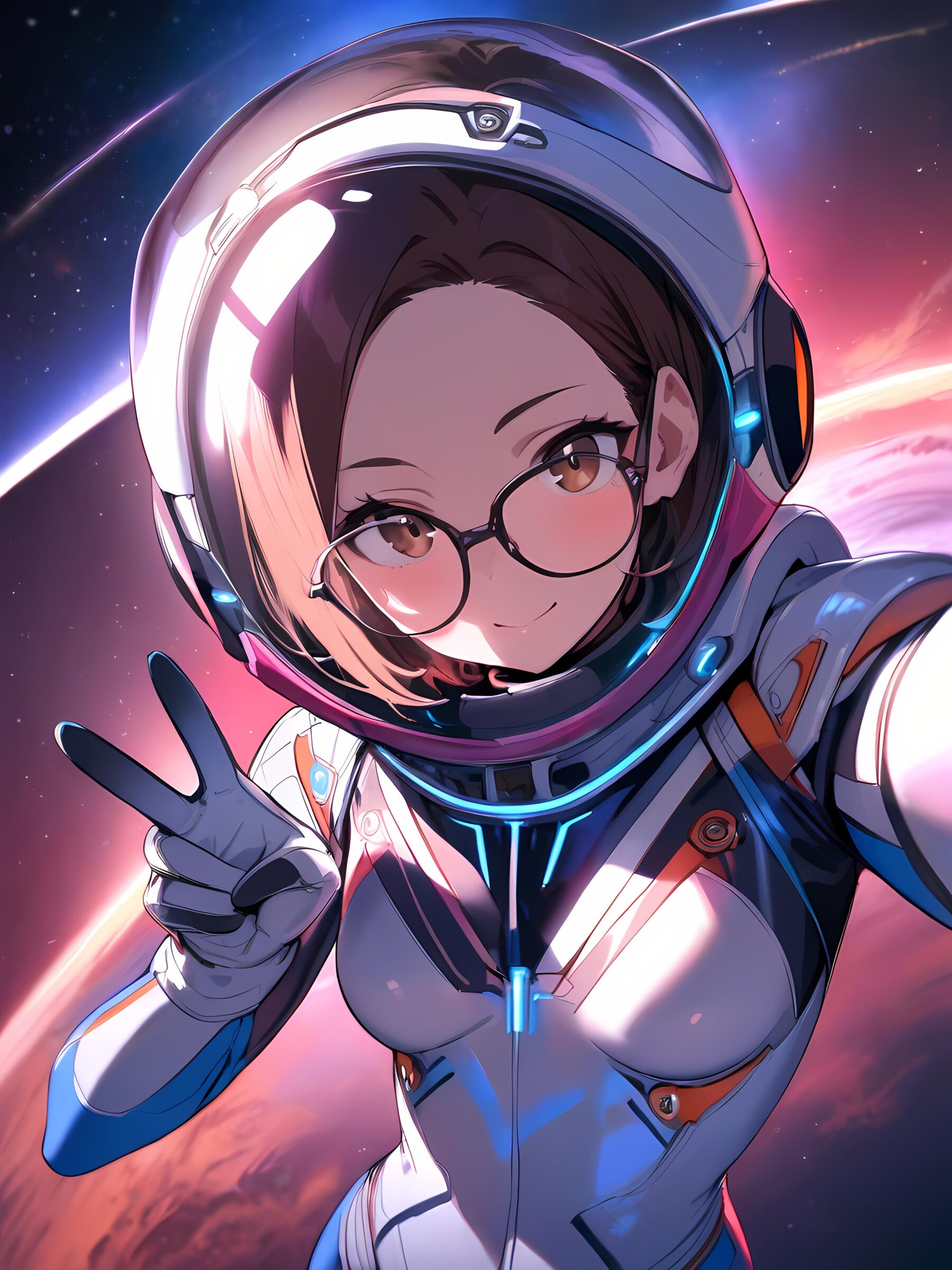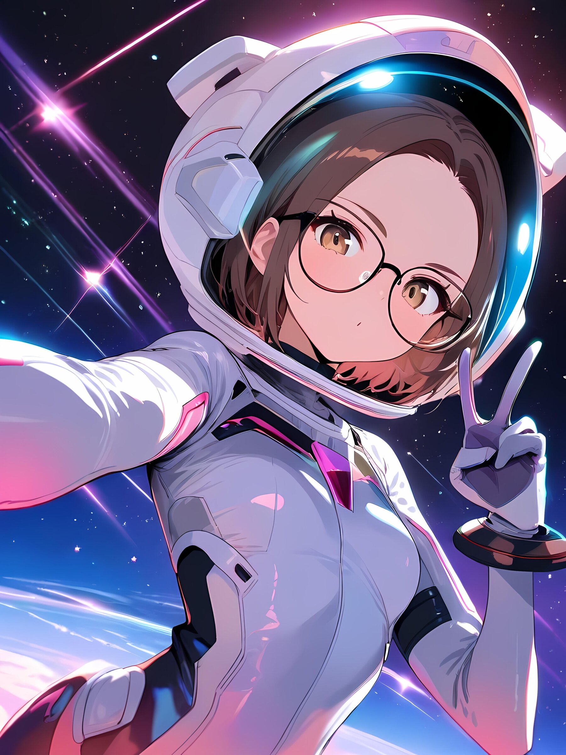 forehead, glasses, short hair, brown hair, small breasts, astronaut taking selfie in space, floating in zero gravity, starry galaxy background, reflective helmet, futuristic suit, cinematic lighting, Peace sign