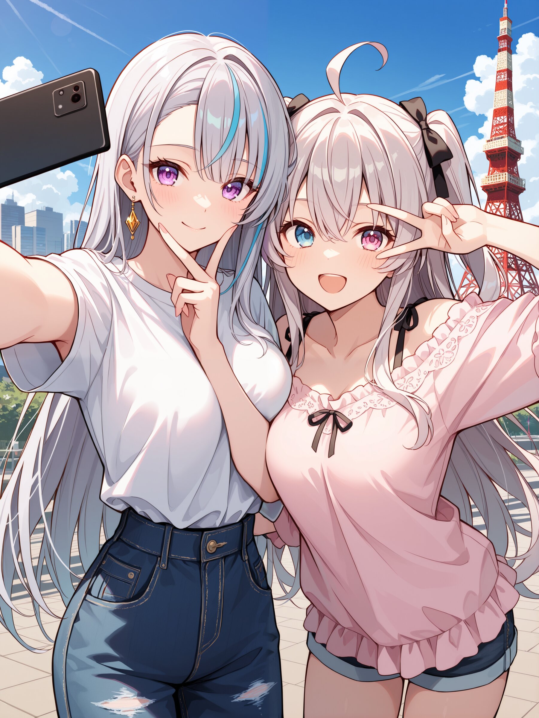 2girls, selfie, selfie stick, v over mouth, outdoors,tokyo tower,
