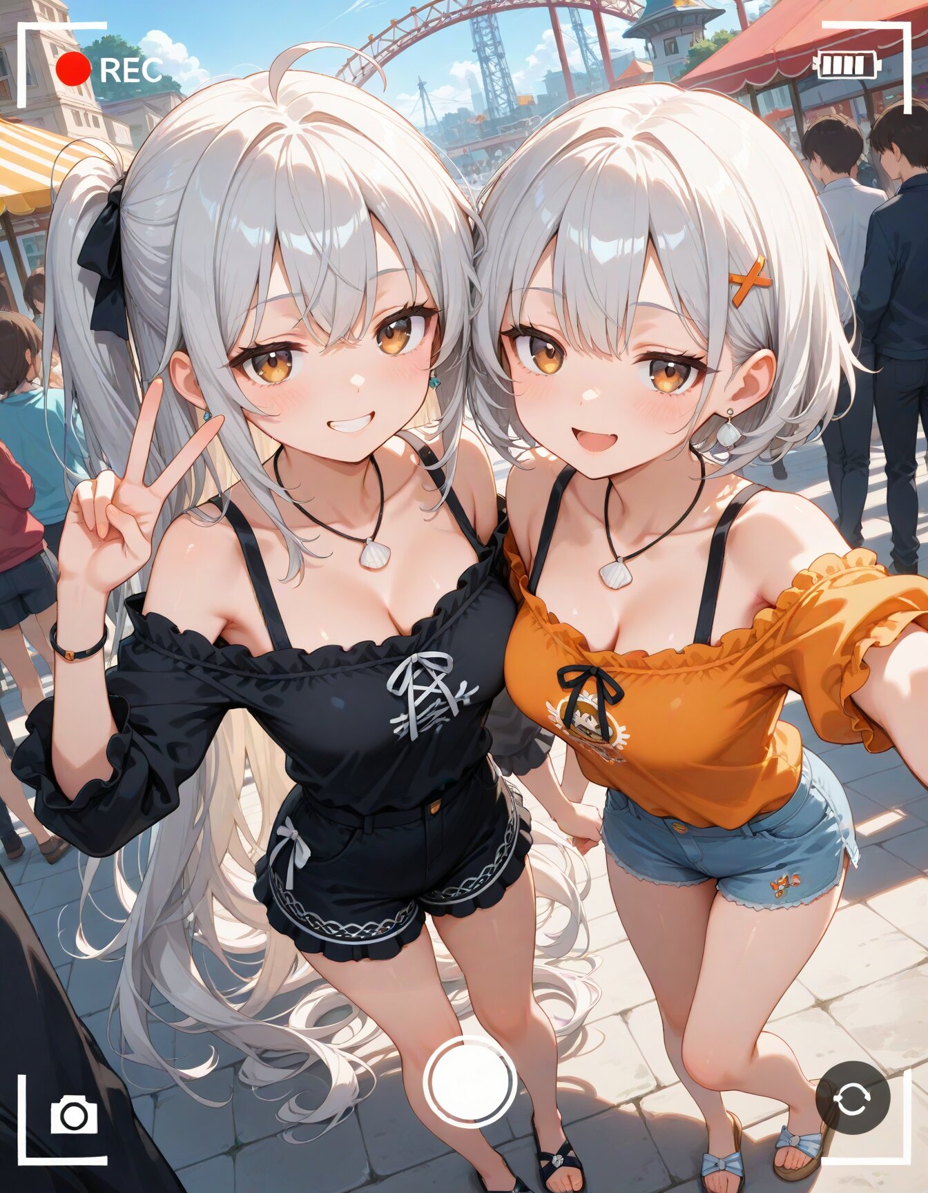 2girls, ahoge, absurdly long hair, side ponytail, gray hair, hairpin, cheerful, smile, (open mouth), brown eyes, jitome, yuri, looking at viewer, medium breasts, selfie, viewfinder, Off-the-shoulder_romper, Straw_wedge_sandals, Shell_necklace, amusement park, crowd, <DIV> 2girls, ahoge, side ponytail, bob cut hair, gray hair, hairpin, brown eyes, jitome, yuri, looking at viewer, grin, (peace sign one hand:1.1), medium breasts, cleavage, Silk_cami_top, very short miniskirt, Statement_earrings, amusement park, crowd, Dutch angle shot