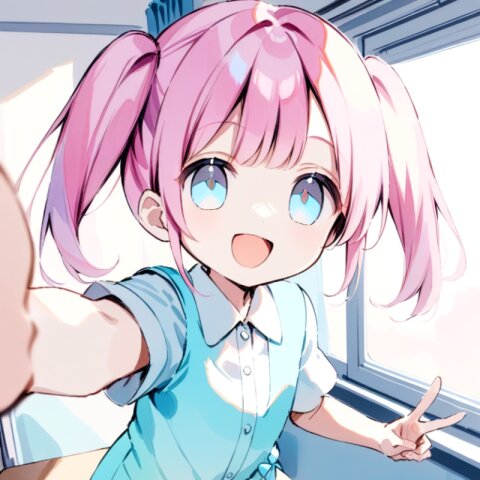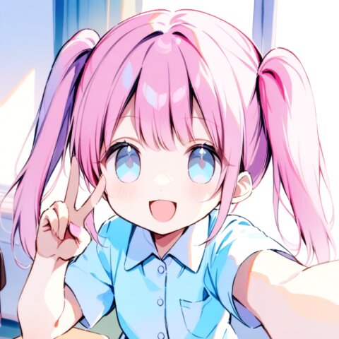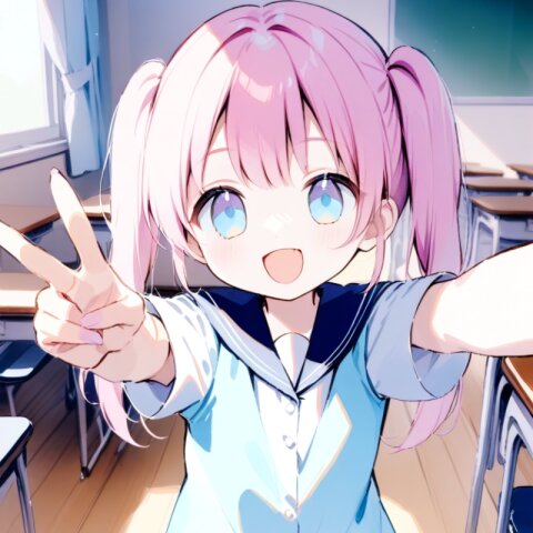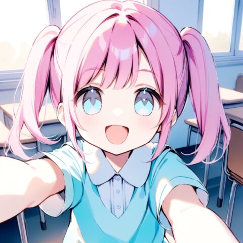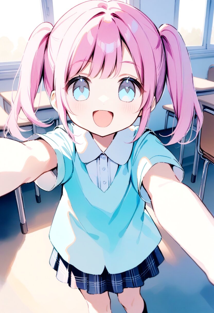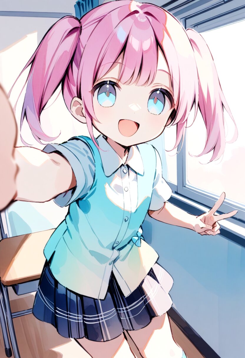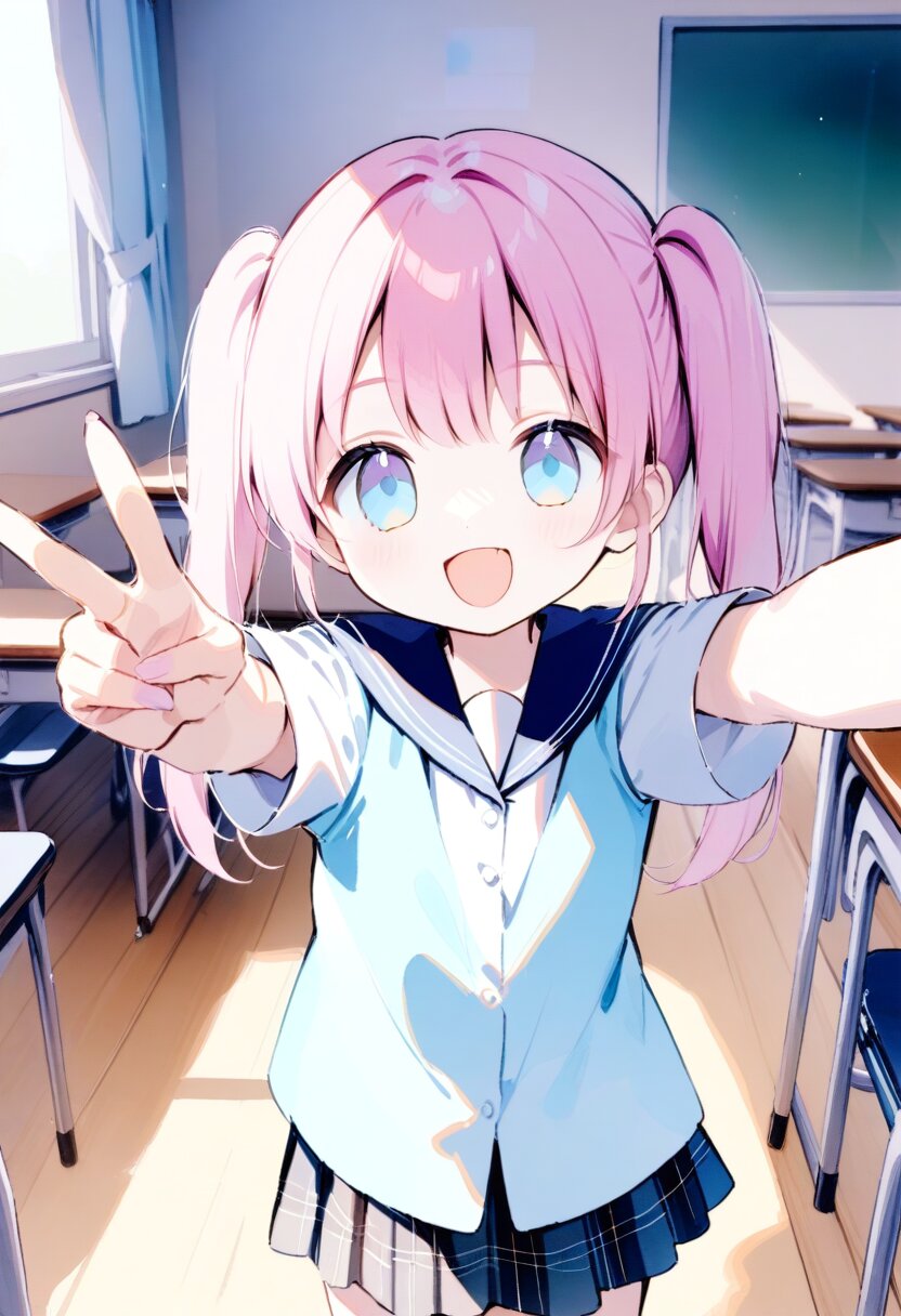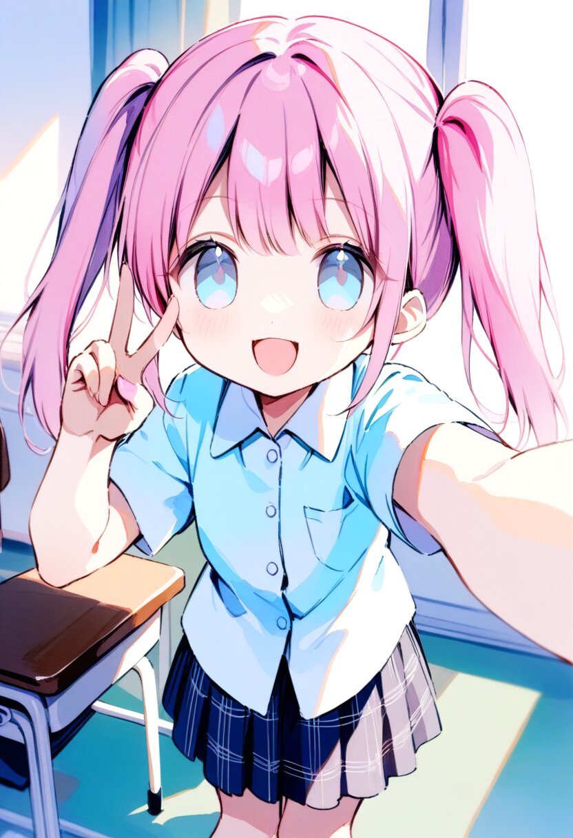 <lora:inmnstylexl:1>, <lora:yumekawaii_ftr:1>best quality, masterpiece, very aesthetic, watercolor painting, pastel colors, general, 1girl, 10 years old, pink hair, twintails, light blue eyes, smile, open mouth, white shirt, shortsleeves, navy plaid skirt, v, selfie, classroom, from above