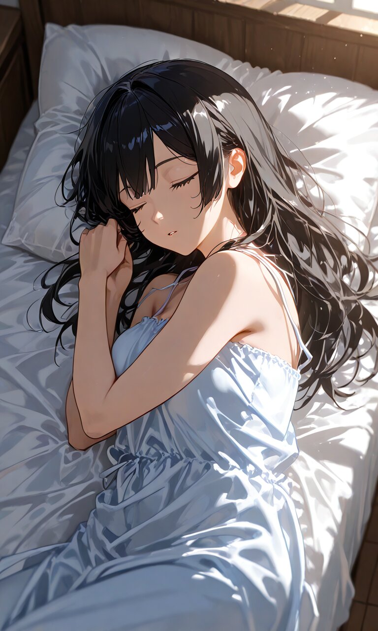1 lady, long hair, black hair, blant bangs, cool, breasts, (morning, sleeping on bed)