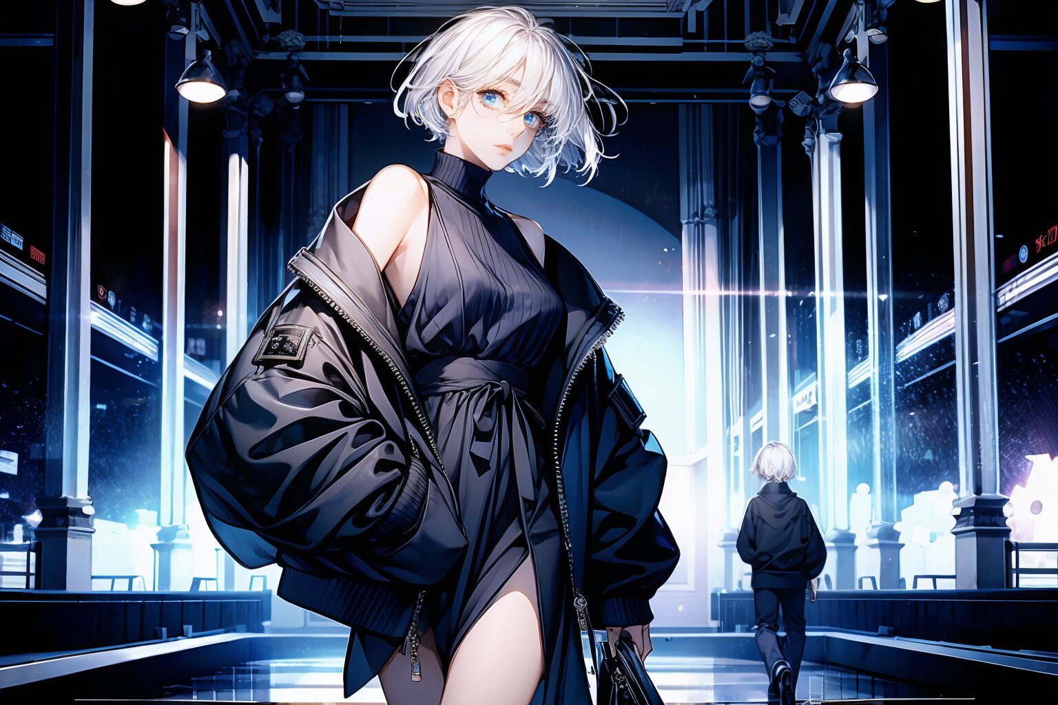 absurdres,detailed and intricate, (best quality), BREAK,solo,1girl,40yo,cowboy shot,fashion model,walk down a runway,pale skin, BREAK,(white hair),extra short hair, BREAK,blue eyes,eyebrows,sanpakugan,bags under eyes, BREAK,(bare shoulders Jacket:1.1),oversize Jacket,(unique fashion),mode fashion,Yohji Yamamoto brand fashion,(high-brand fashion:1.3), BREAK,Fashion show,runway,catwalk,