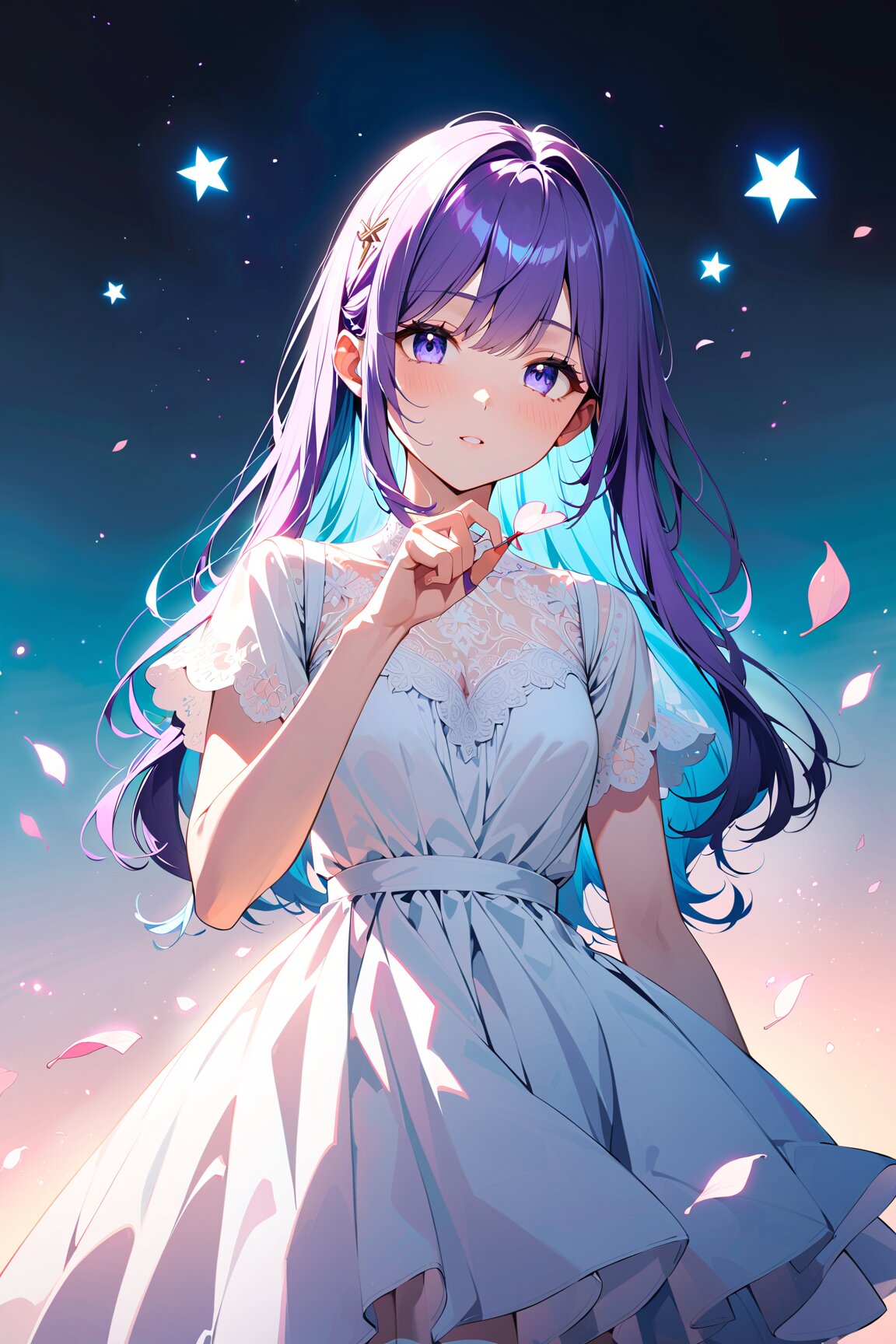 cute anime girl, standing under a clear spring sky, soft morning sunlight, diffused backlight shining through her long straight bluish purple hair with light blue inner highlights, wearing a light white one-piece dress with delicate lace and small pink ribbons, hairpin shaped like a star, holding a small cherry blossom petal gently, pastel color tones, muted colors, soft color palette, slightly misty spring background, floating sakura petals, glowing ambient light, dreamy atmosphere, delicate and emotional expression, ephemeral feeling, masterpiece, ultra-detailed, anime style hair color is bluish purple with light blue inner highlights, no pink colors, no pink hair