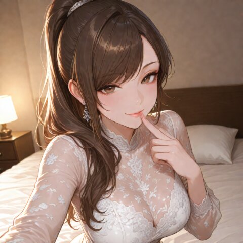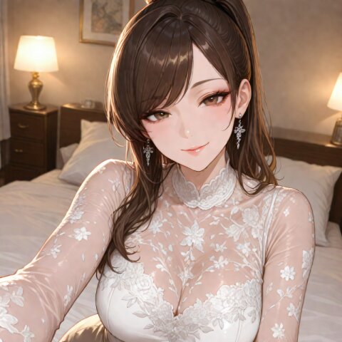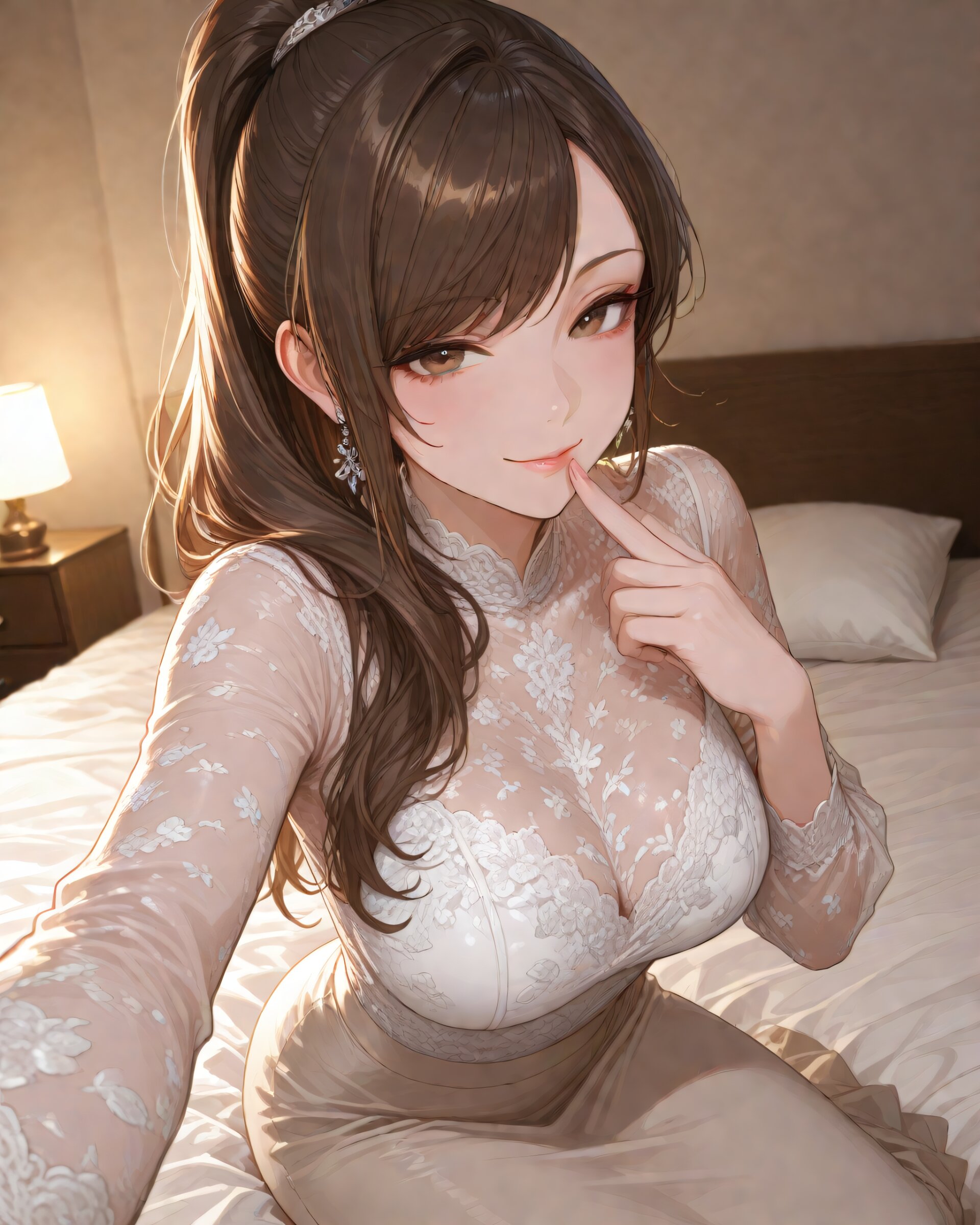 <lora:hyper_sdxl_8_step_lora_f16:1>,, 1Girl, selfie, indoors, focus face, bed room, BREAK beautiful lady, Married woman, 30 years old, long hair, (brown hair), high ponytail, swept bangs, large breasts,, smile, white lace floral dress, see through, long skirt, earrings, seductive smile, BREAK masterpiece, amazing quality, best quality, ultra-detailed, 8K, newest, vivid, dramatic lighting,