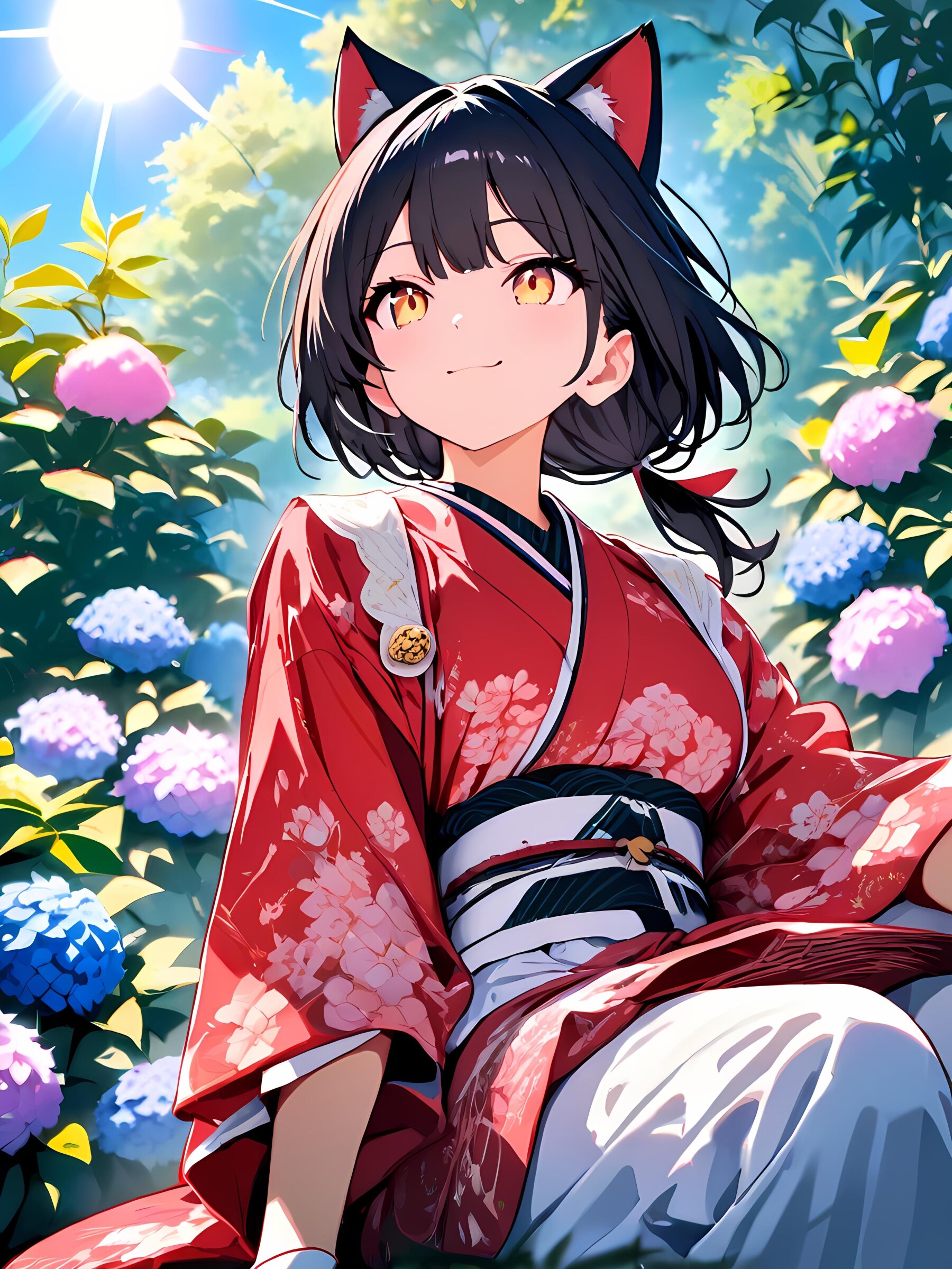 4k resolution, beautiful highlight, beautiful Blue Sky, sun, hydrangea, solo, gem pupil, amber eyes, solo, low ponytail, black hair, cat ears, samurai, red kimono, smile, dynamic angle, sit-down,