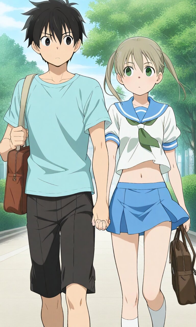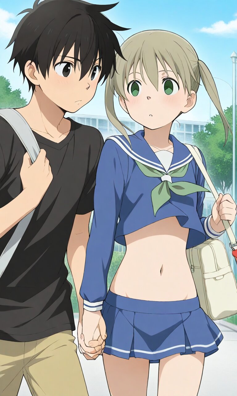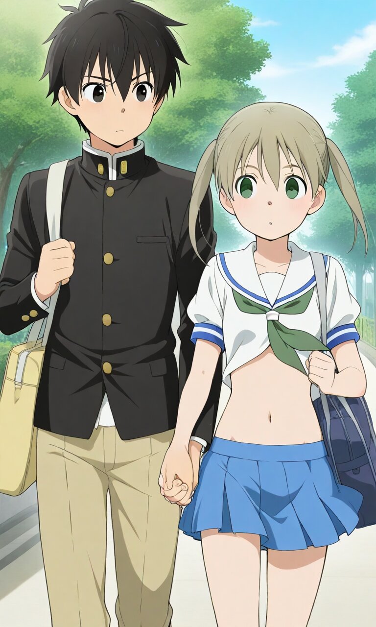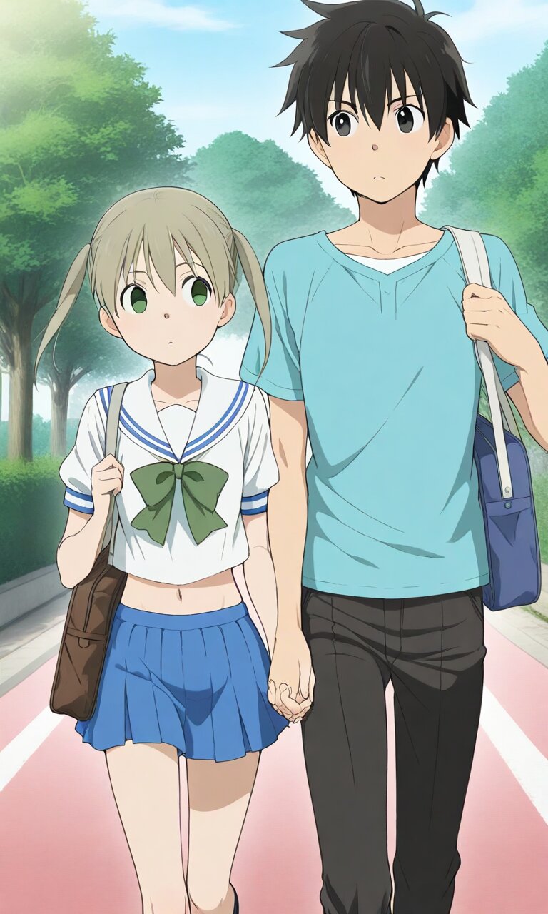 Couple, boy and girl, two people only,absurdres, ultra-detailed, master piece, high resolution, 8k, Boy, girl, couple,Morning, on the way to school, a couple running to school in a hurry, holding hands, both in a great hurry BREAK Girl, navel, sailor suit, short sleeves, mini skirt, bag over shoulder BREAK Boy, black school run, long sleeves, shoulder bag BREAK the boy(original boy,black eyes, black short hair) BREAK the girl(maka albarn, blonde hair, twintails, green eyes, bangs, anime screencap ),