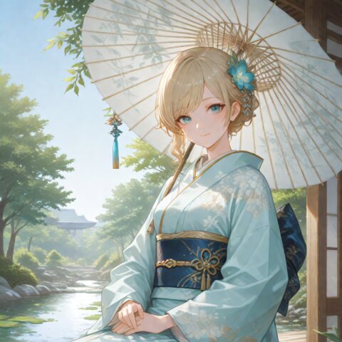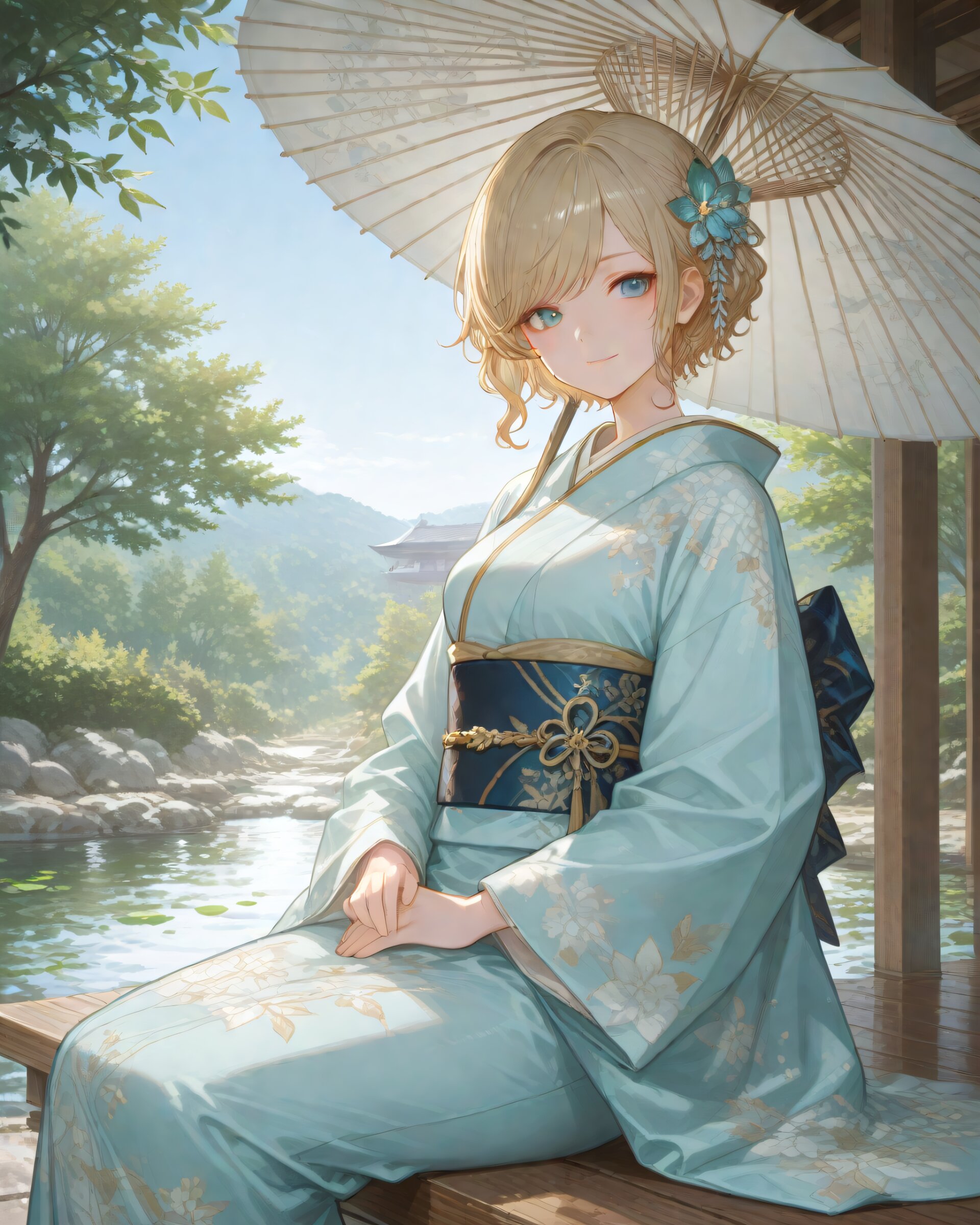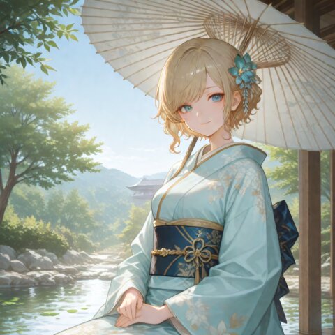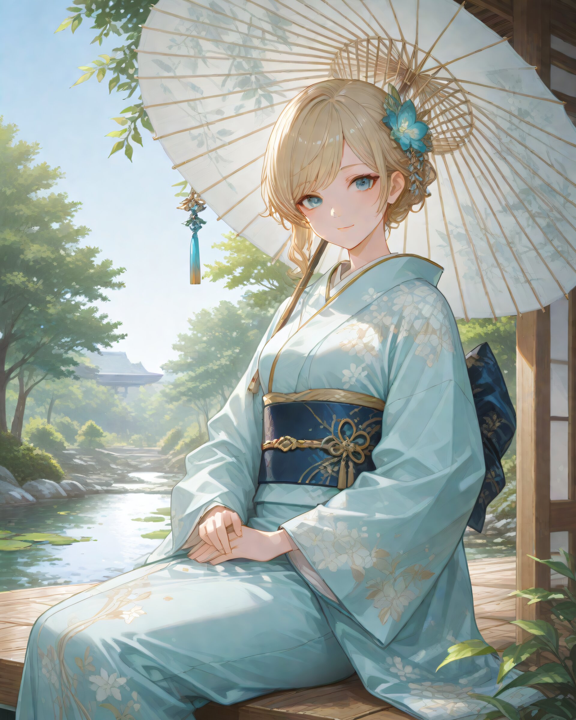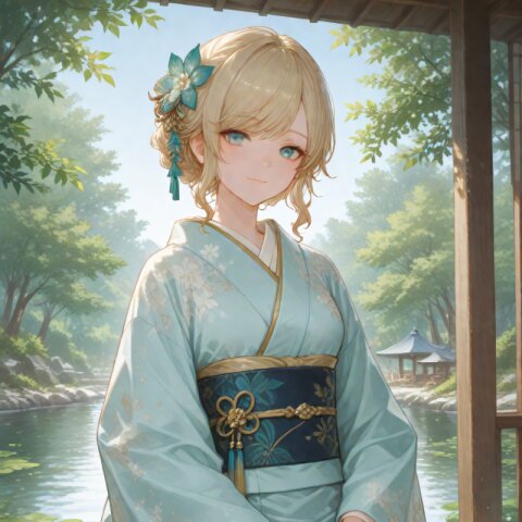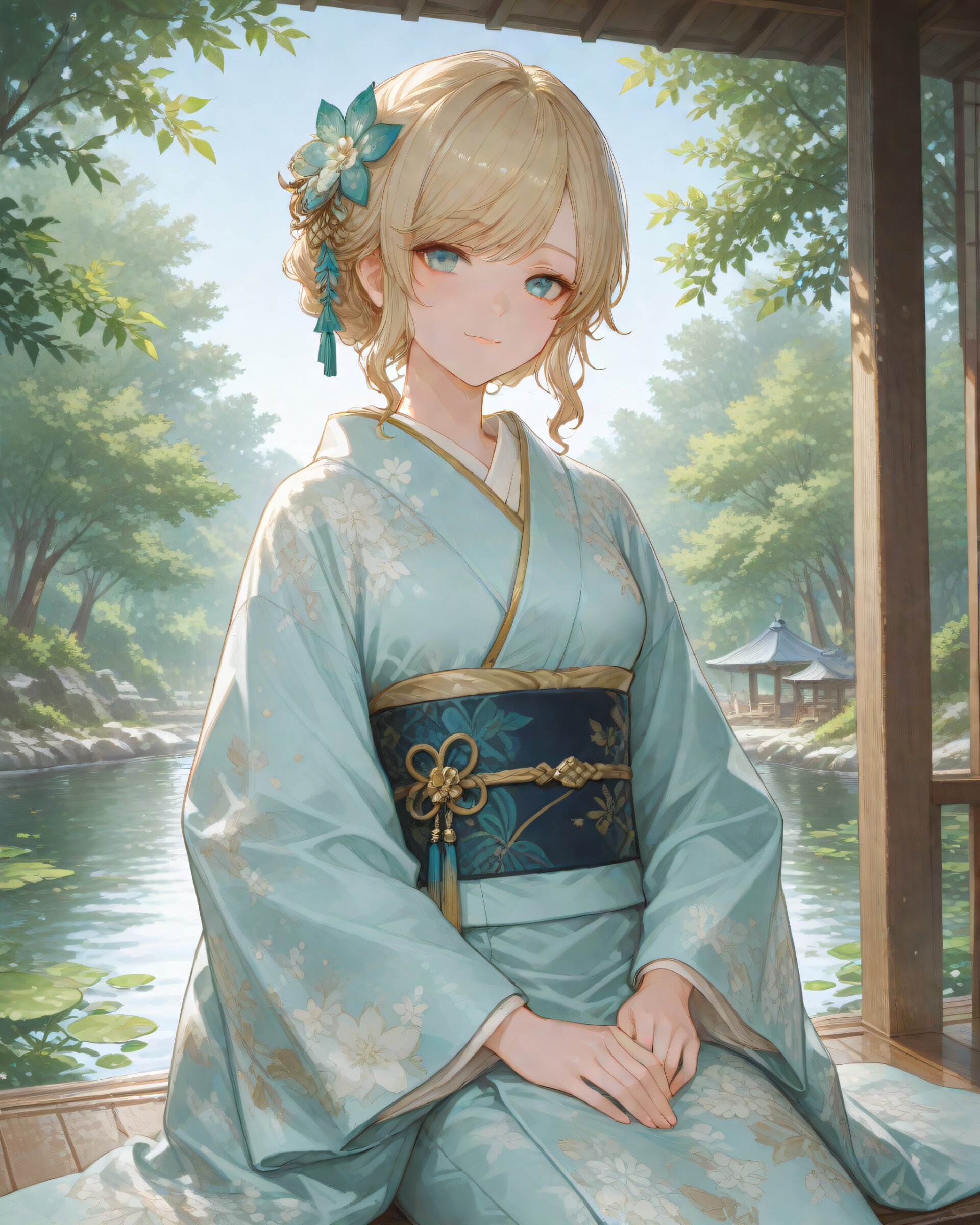 <lora:hyper_sdxl_8_step_lora_f16:1>,, 1girl, A traditional Japanese garden in early May under a clear blue sky, (bright green leaves shimmering in the sunlight), serene pond, parasol on the veranda, peaceful and tranquil atmosphere, focus face, BREAK 18 years old, girl, short hair, wavy blonde hair, swept bangs, medium breasts, slender, frosty blue eyes, janapnese kimono, furisode, hair ornaments, cute smile, BREAK masterpiece, amazing quality, best quality, very aesthetic, ultra-detailed, 8K, newest,