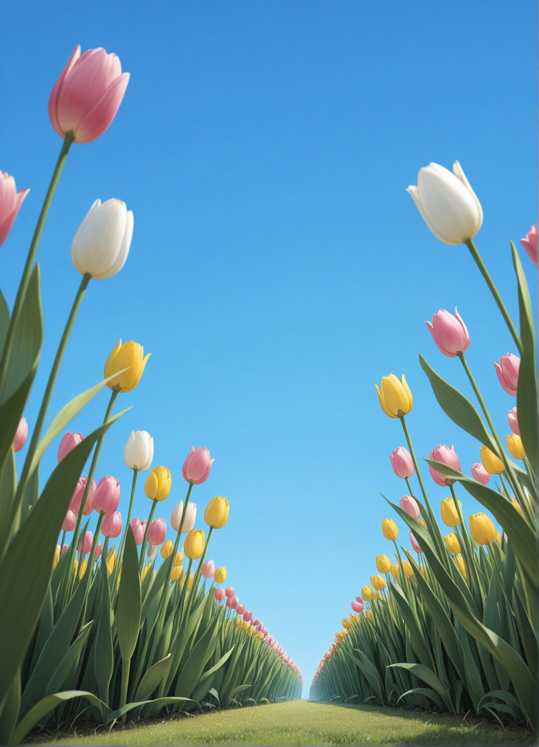 masterpiece,best quality,highres,highly detailed,(realistic,clear weather,blue sky,bright sky,daytime),many tulip,Many kinds of tulip,landscape,wide shot,no humans,from below,