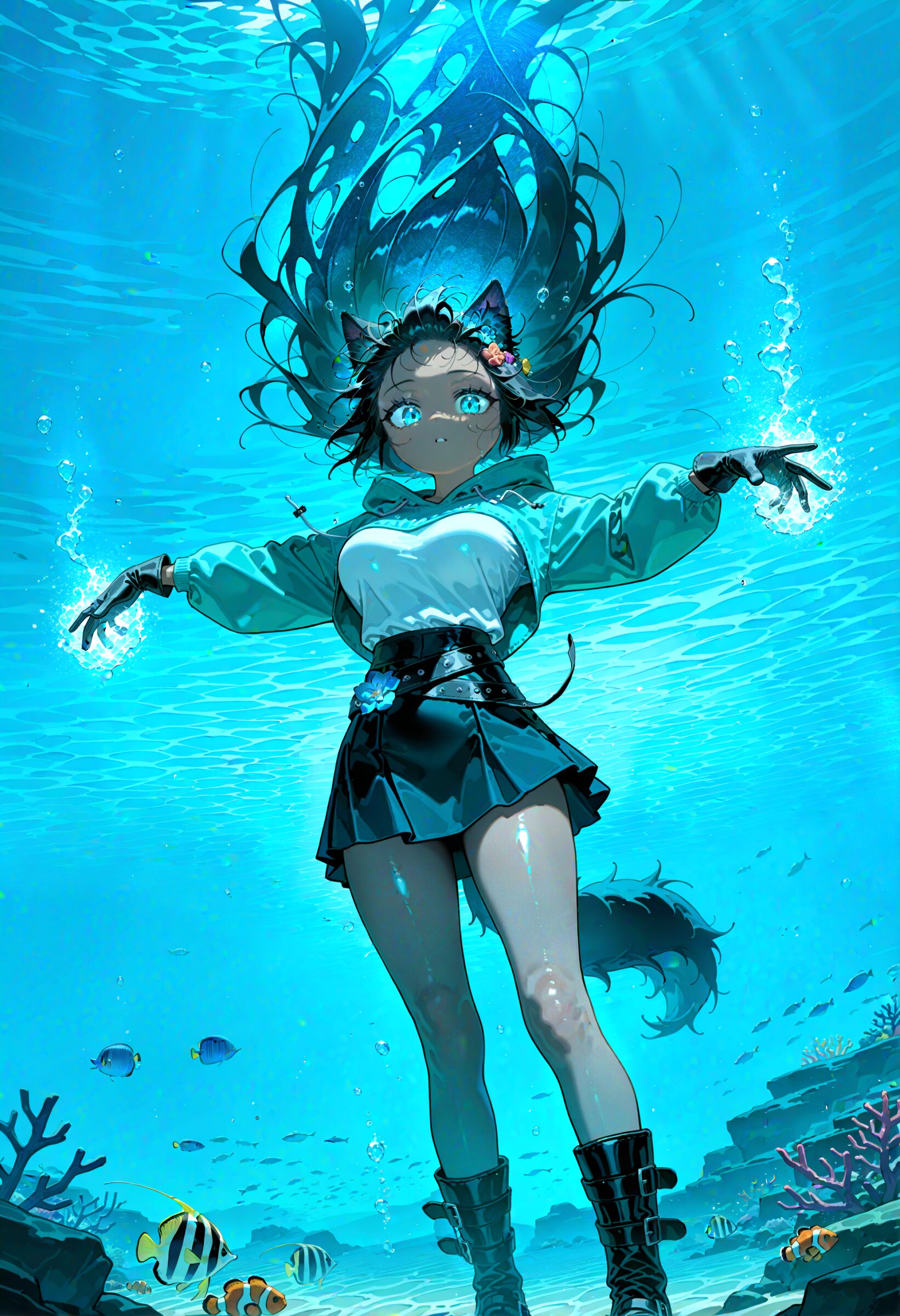 from behind, thrust out one's hip, looking another (character focus:1.2) from below, looking down, , looking at viewer, surgeonfish, tropical fish, underwater, clownfish, butterflyfish, coral, seaweed, bubble, floating hair 1girl, black wolf ears, dark skin, young beautiful girl, large breasts, tall, wolf tail, (aristocratic features), (Black Hair:1.2) (disheveled long hair over ears:1.3) messy hair ornament flower, (perfect turquoise eyes:1.3) long eyelashes,, wearing turquoise hood down and white tube top leather gloves, lether miniskirt, belt boots, turquoise hoodie, water magic, , freediving, upside-down underlighting, super fine concept art, hard surface, 8K, unreal engine, masterpiece, best quality, amazing quality, very aesthetic, absurdres you can add scenery, (volumetric lighting), To make the background more distinctive. professional art lots of details, , overexposure, shiny-glistening, (watercolor style:0.5), (pastel color style:1.0) <lora:noline (1):-0.5> <lora:sdxl2-flat2-512b:0.2> <lora:facelightup_xl_v10:0.5>