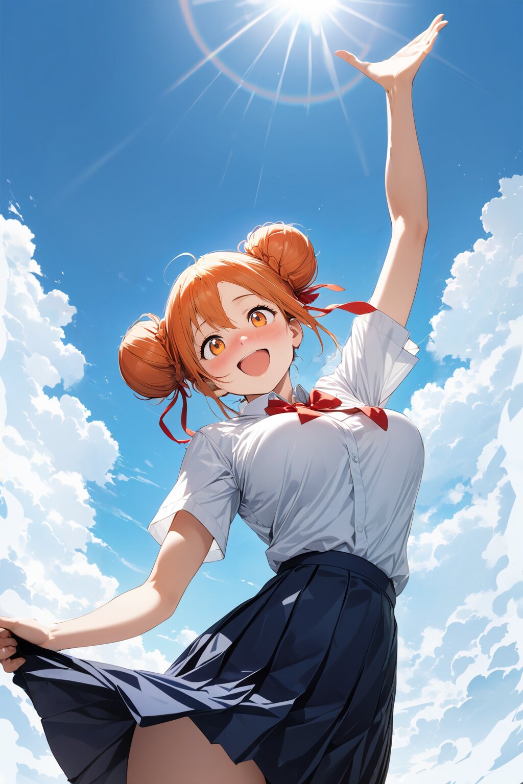 1girl, (blue sky:1.3),outdoor,(bloom,sunlight), large breasts, orange hair,(double bun),(center parted bangs),sideburns,hair side red string ribbon, small orange eyes, noseblush,naughty smile,open mouth,happy, school uniform,(white collared shirt:1.2),(dark blue skirt:1.3),red bow,white panties,short sleeve, arm up,arched back,reach out, cowboy shot,dynamic angle,look up at the sky,from side,from below,(dutch angle), ((best quality)),((very high resolution)),full color,((ultra detailed)),extremely detailed CG,super fine illustration, manga style,hyperrealistic,photorealistic, perfect anatomy,super detailed skin,(beautiful detailed clear eyes),